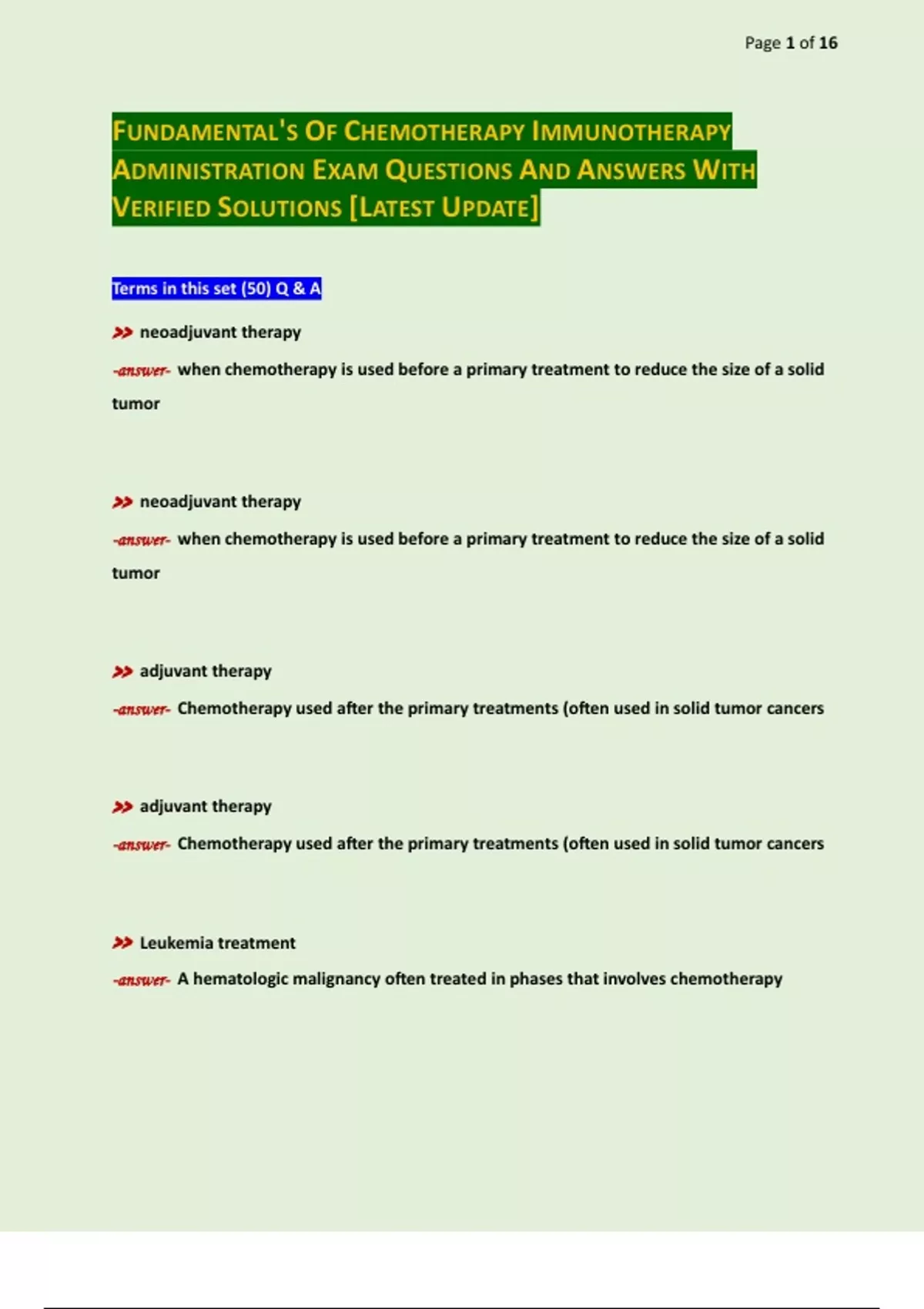 FUNDAMENTALS OF CHEMOTHERAPY IMMUNOTHERAPY ADMIN ONS EXAM 1 QUESTIONS AND ANSWER [LATEST UPDATED VERSION]