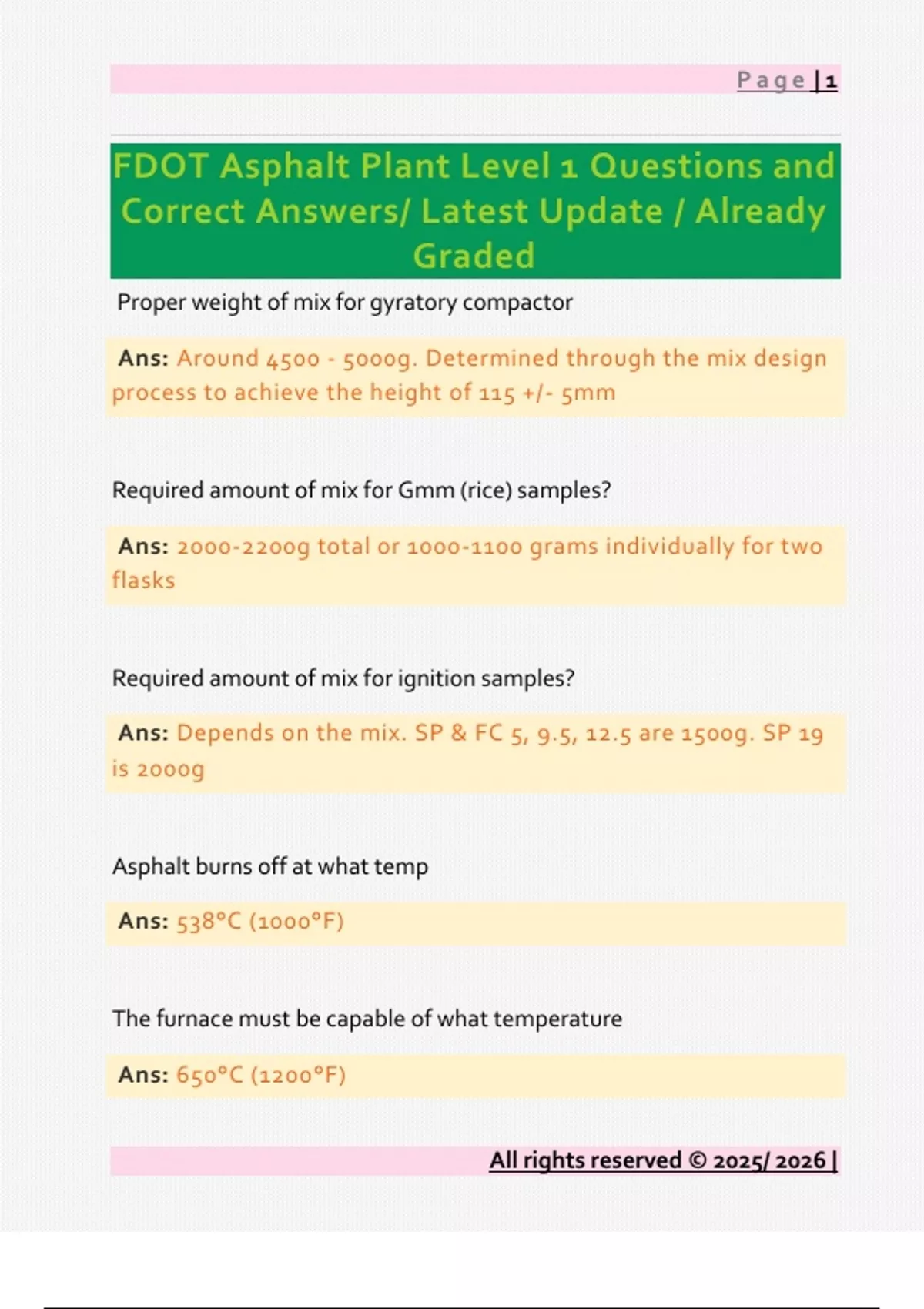 FDOT Asphalt Plant Level 1 Questions and Correct Answers/ Latest Update / Already Graded