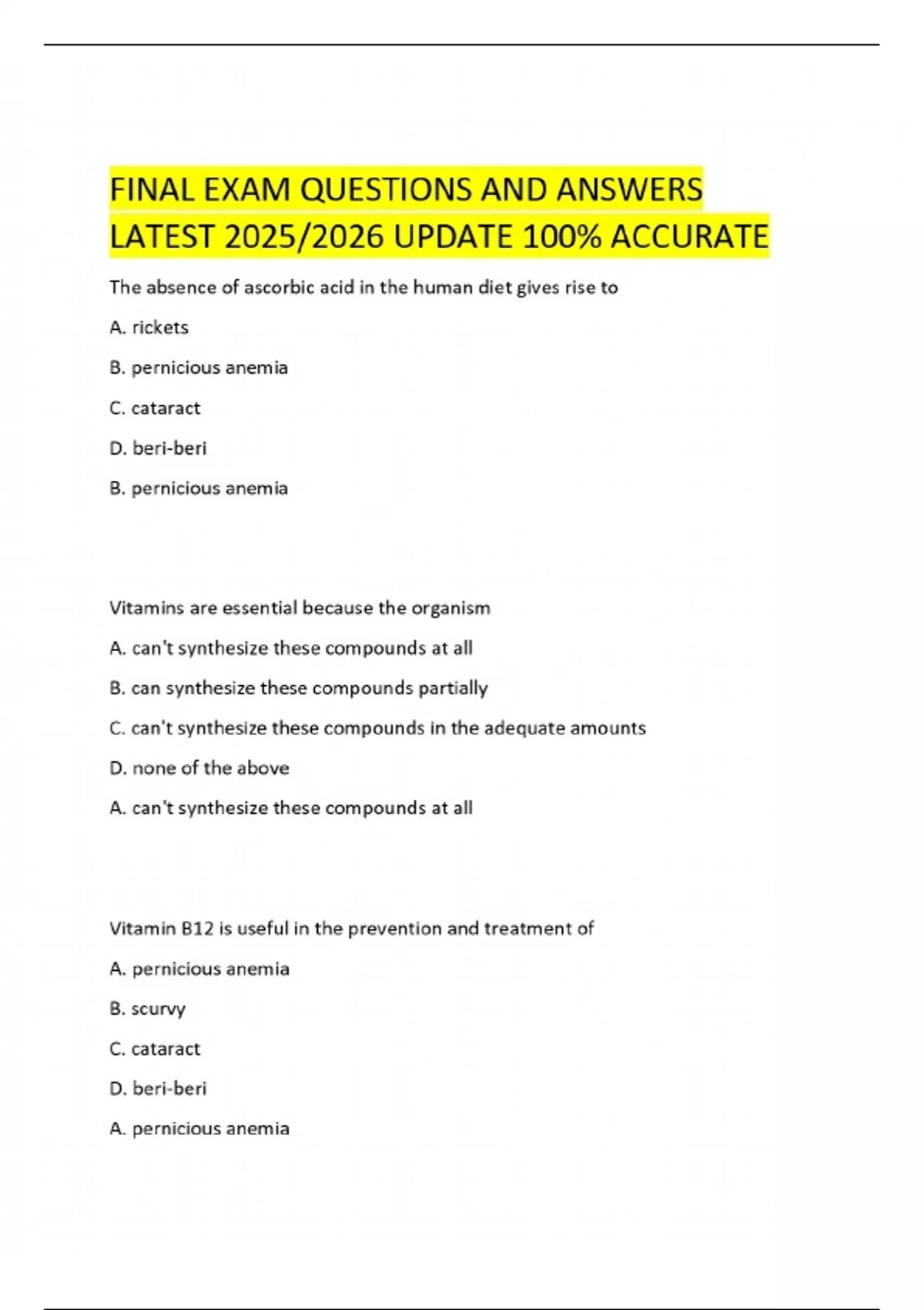 FINAL EXAM QUESTIONS AND ANSWERS LATEST 2025/2026 UPDATE 100% ACCURATE The absence of ascorbic acid in the human diet gives rise to A. rickets B. pernicious anemia C. cataract D. beri-beri B. pernicious anemia Vitamins are essential because the organism A. can't synthesize these compounds at all B. can synthesize these compounds partially