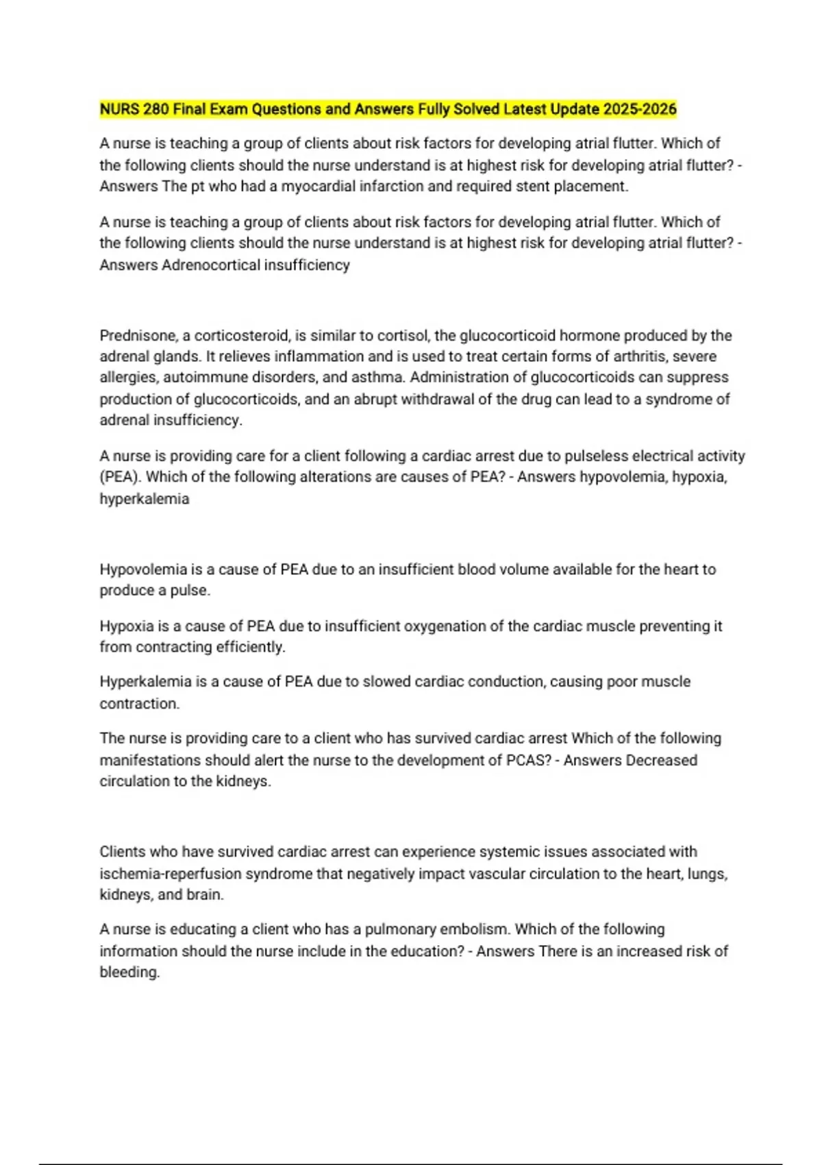 NURS 280 Final Exam Questions and Answers Fully Solved Latest Update A nurse is teaching a group of clients about risk factors for developing atrial flutter. Which of the following clients should the nurse understand is at highest risk for developing atrial flutter? - Answers The pt who had a myocardial infarction and required stent placement. A nurse is teaching a group of clients about risk factors for developing atrial flutter. Which of the following clients should the nurse understand is at highest risk for developing atrial flutter? - Answers Adrenocortical insufficiency Prednisone, a corticosteroid, is similar to cortisol, the glucocorticoid hormone produced by the adrenal glands. It relieves inflammation and is used to treat certain forms of arthritis, severe allergies, autoimmune disorders, and asthma. Administration of glucocorticoids can suppress production of glucocorticoids, and an abrupt withdrawal of the drug can lead to a syndrome of adrenal insufficiency. A nurse is providing care for a client following a cardiac arrest due to pulseless electrical activity (PEA). Which of the following alterations are causes of PEA? - Answers hypovolemia, hypoxia, hyperkalemia Hypovolemia is a cause of PEA due to an insufficient blood volume available for the heart to produce a pulse. Hypoxia is a cause of PEA due to insufficient oxygenation of the cardiac muscle preventing it from contracting efficiently. Hyperkalemia is a cause of PEA due to slowed cardiac conduction, causing poor muscle contraction. The nurse is providing care to a client who has survived cardiac arrest Which of the following manifestations should alert the nurse to the development of PCAS? - Answers Decreased circulation to the kidneys. Clients who have survived cardiac arrest can experience systemic issues associated with ischemia-reperfusion syndrome that negatively impact vascular circulation to the heart, lungs, kidneys, and brain. A nurse is educating a client who has a pulmonary embolism. Which of the following information should the nurse include in the education? - Answers There is an increased risk of bleeding. Clients who have a pulmonary embolism will require anticoagulants which puts them at risk for bleeding. The impact on the client's health varies greatly on the size of the emboli and quality of manifestations caused by the emboli. A nurse caring for a client who has hypertension and asks the nurse about a prescription for