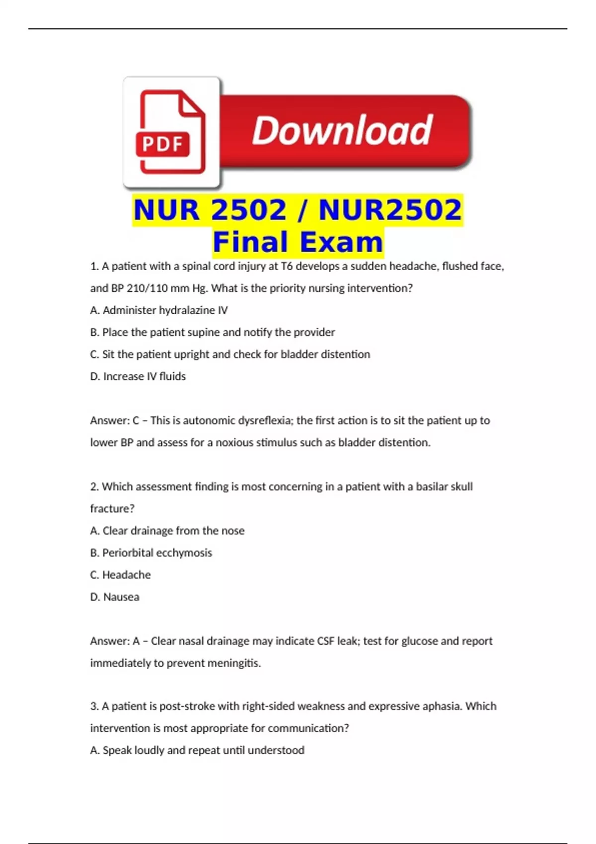 Answer: C – This is autonomic dysreflexia; the first action is to sit the patient up to