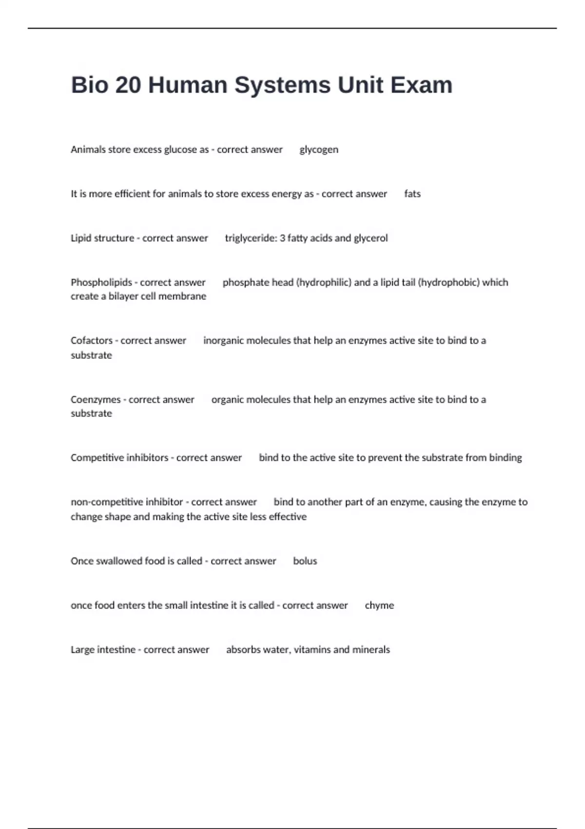 Phospholipids - correct answer phosphate head (hydrophilic) and a lipid tail (hydrophobic) which
