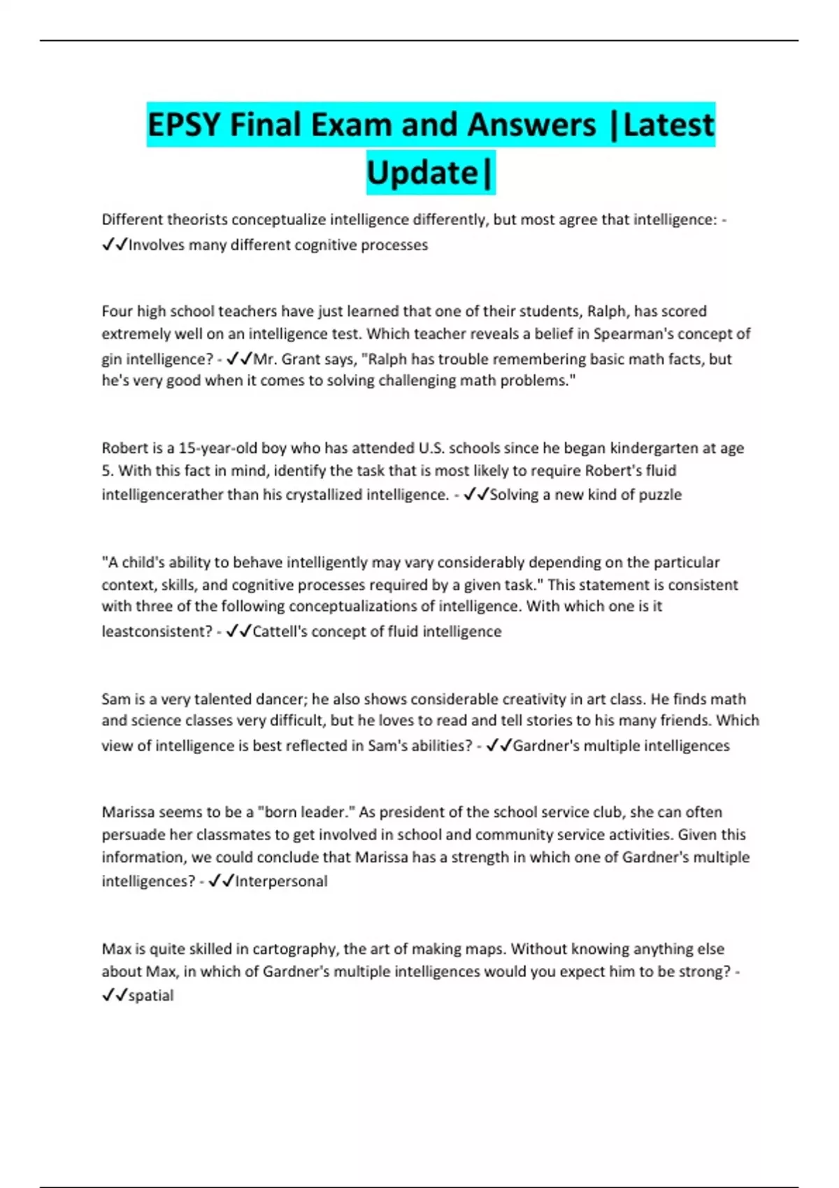 Different theorists conceptualize intelligence differently, but most agree that intelligence: - Involves many different cognitive processes Four high school teachers have just learned that one of their students, Ralph, has scored extremely well on an intelligence test. Which teacher reveals a belief in Spearman's concept of gin intelligence? - Mr. Grant says, "Ralph has trouble remembering basic math facts, but he's very good when it comes to solving challenging math problems." Robert is a 15-year-old boy who has attended U.S. schools since he began kindergarten at age 5. With this fact in mind, identify the task that is most likely to require Robert's fluid intelligencerather than his crystallized intelligence. - Solving a new kind of puzzle "A child's ability to behave intelligently may vary considerably depending on the particular context, skills, and cognitive processes required by a given task." This statement is consistent with three of the following conceptualizations of intelligence. With which one is it leastconsistent? - Cattell's concept of fluid intelligence Sam is a very talented dancer; he also shows considerable creativity in art class. He finds math and science classes very difficult, but he loves to read and tell stories to his many friends. Which view of intelligence is best reflected in Sam's abilities? - Gardner's multiple intelligences