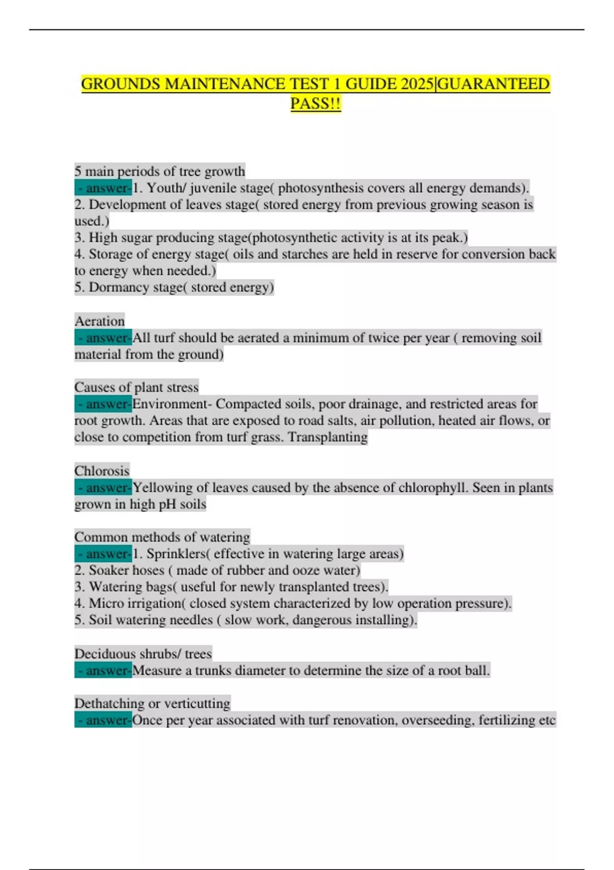 Master Grounds Maintenance with Expert-Verified Answers! This 2025 exam guide is your ultimate resource for acing Grounds Maintenance certification tests. Packed with 100% verified answers, this document covers every critical topic you need to dominate your exam: Tree & Turf Science: 5 growth stages, chlorosis causes, and glucose’s role in plant energy. Soil & Water Management: pH adjustment, aeration schedules, and drainage solutions. Fertilization & Weed Control: Slow-release formulas, pre/post-emergent herbicides, and seasonal timing. Practical Techniques: Root ball sizing, mulching benefits, and dethatching best practices. Seasonal Protocols: Dormancy care, renovation steps, and weather-based watering strategies. Why Buy This? Guaranteed Pass: Perfect for groundskeepers, landscapers, and certification candidates. Industry-Standard Knowledge: Aligned with NRPA and ISA (International Society of Arboriculture) guidelines. Time-Saving: Clear, concise answers—no fluff, just actionable insights!