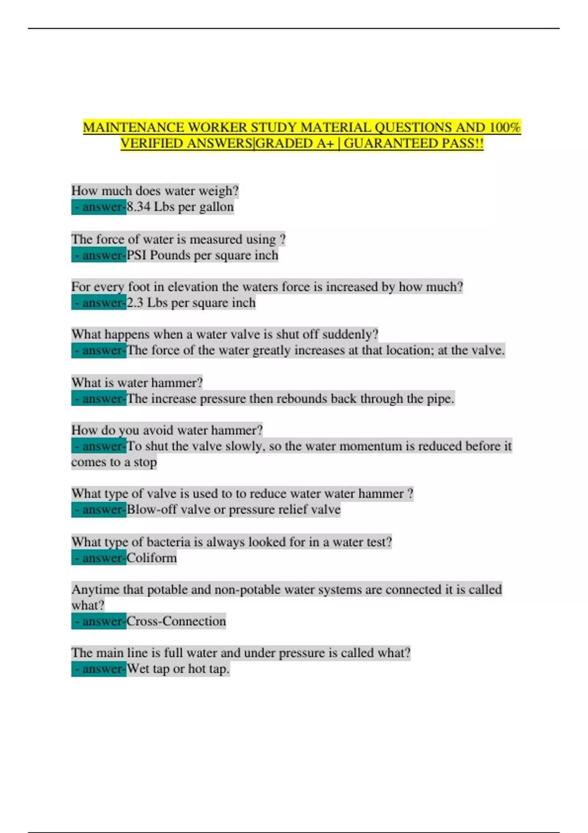 MAINTENANCE WORKER STUDY MATERIAL QUESTIONS AND 100%