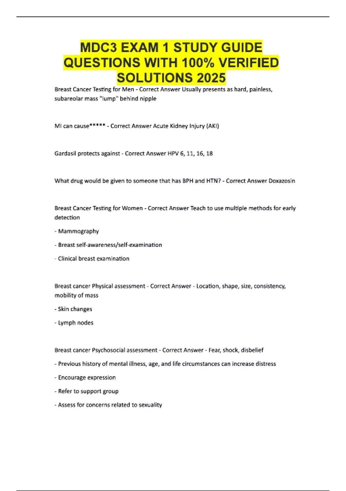 MDC3 EXAM 1 STUDY GUIDE QUESTIONS WITH 100% VERIFIED SOLUTIONS 2025 Breast Cancer Testing for Men - Correct Answer Usually presents as hard, painless, subareolar mass "lump" behind nipple MI can cause***** - Correct Answer Acute Kidney Injury (AKI) Gardasil protects against - Correct Answer HPV 6, 11, 16, 18 What drug would be given to someone that has BPH and HTN? - Correct Answer Doxazosin Breast Cancer Testing for Women - Correct Answer Teach to use multiple methods for early detection - Mammography - Breast self-awareness/self-examination - Clinical breast examination Breast cancer Physical assessment - Correct Answer - Location, shape, size, consistency, mobility of mass - Skin changes - Lymph nodes Breast cancer Psychosocial assessment - Correct Answer - Fear, shock, disbelief - Previous history of mental illness, age, and life circumstances can increase distress - Encourage expression - Refer to support group - Assess for concerns related to sexuality Breast cancer Laboratory assessment - Correct Answer - Pathologic study of breast mass tissue and lymph nodes - Liver enzymes, serum calcium, alkaline phosphatase Breast cancer Imaging assessment - Correct Answer - Mammography - Tomosynthesis - Ultrasonography - MRI - Chest x-ray, CT for metastasis Breast cancer Risks for Men - Correct Answer · Family history (M or F) of breast cancer · BRCA 1/2 mutation · Elevated estrogen levels · Exposure to radiation