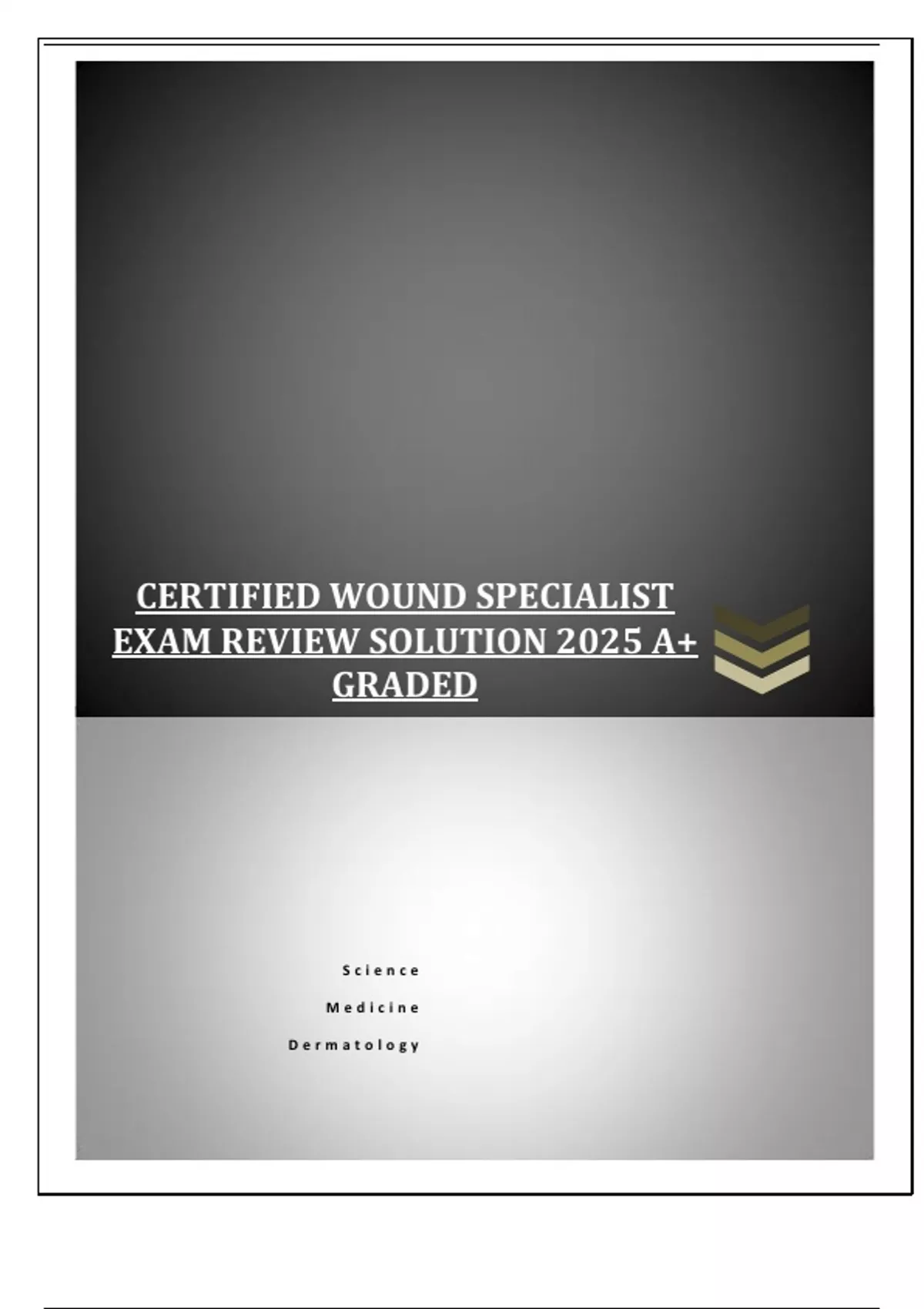 CERTIFIED WOUND SPECIALIST EXAM REVIEW SOLUTION 2025 A+ GRADED Describe the structure of the dermis. - Correct Answer-Thick, dense, Fibroelastic, connective tissue that is highly vascularized. What is the function of the epidermis? - Correct Answer-Provides a barrier against toxic substances and microorganisms, prevent water loss, and repel water What is the function of the mast cell? - Correct Answer-Use histamine and heparin to assist with blood clotting during injury What is the function of Langerhans cells? - Correct Answer-Are the first line of defense against environmental antigens by capturing, uptaking, and processing antigens that stimulate an immune response What cells are located in the epidermis? - Correct Answer-keratinocytes, melanocytes, langerhans cells, merkel cells What structures are found in the reticular layer of the dermis? - Correct Answer-Nerves, sweat glands, sebaceous glands, and hair follicles What is the function of a platelet? - Correct Answer-Form a platelet plug as part of the clotting process What are the functions of the skin? - Correct Answer-Protection, immunity, thermoregulation, sensation, metabolism, and communication What is the function of the macrophage? - Correct Answer....