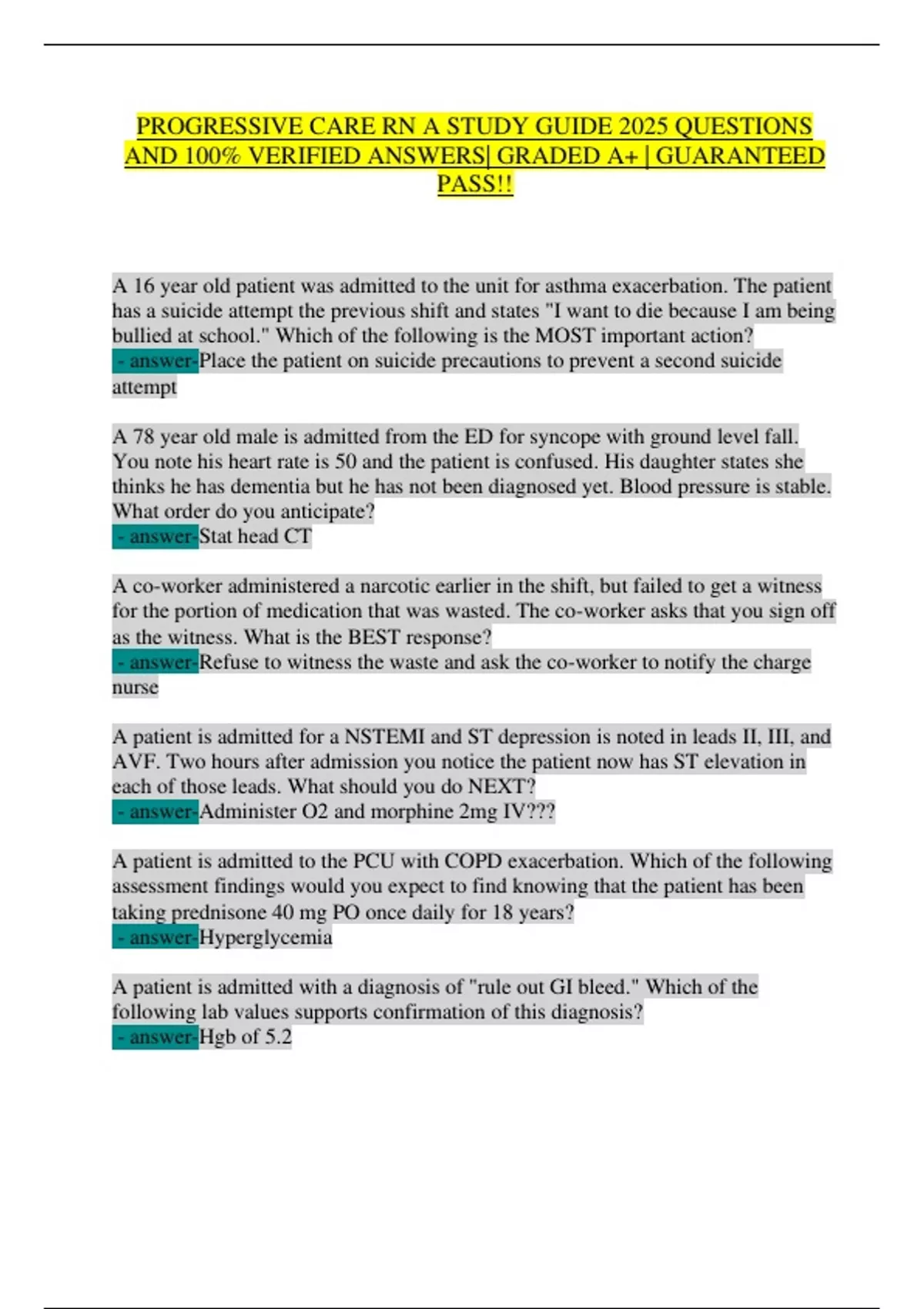 Ace Your Progressive Care RN (PCU) Certification with Confidence! This 2025 edition study guide is your ultimate resource for mastering the Progressive Care Nursing (PCU) exam. Packed with 100+ high-yield practice questions and 100% verified answers, this guide is meticulously designed to mirror the latest AACN PCCN exam format. Whether you're prepping for the AACN PCCN certification or reinforcing your critical care knowledge, this document ensures you’re exam-ready with: Real-world clinical scenarios (e.g., NSTEMI, COPD exacerbation, DVT, sepsis) Detailed rationales for each answer to solidify understanding Priority-action drills to sharpen your decision-making skills Lab values, EKG interpretations, and pharmacology highlights Bonus tips for tackling tricky NCLEX-style questions Perfect for: PCU nurses, CCRN candidates, and RNs transitioning to critical care.