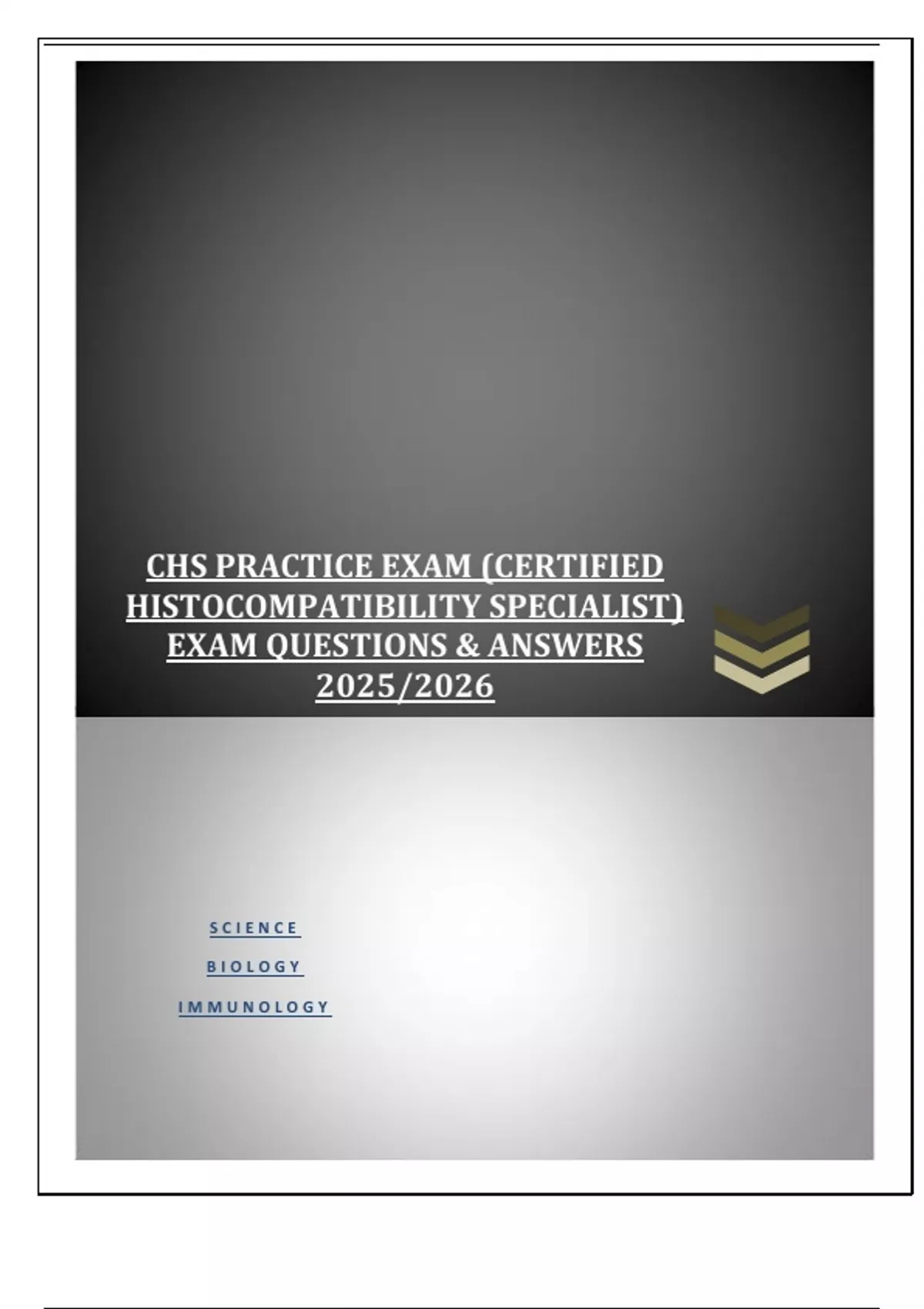 CHS PRACTICE EXAM (CERTIFIED HISTOCOMPATIBILITY SPECIALIST) EXAM QUESTIONS & ANSWERS 2025/2026 Which of the following is not a secondary lymphoid organ? a. Spleen b. Thymus c. Lymph nodes d. Liver e. Tonsils - ANS-Thymus Primary lymphatic organs are where lymphocytes are formed and mature. stem cells to divide and mature into B- and T- cells: There are two primary lymphatic organs: the red bone marrow and the thymus gland. Which of the following is not a component of the reticuloendothelial cell system? a. Microglial cells b. Kupffer cells c. Langerhans cells d. Neutrophils e. Monocytes - ANS-Neutrophils Macrophages = tissue Monocytes = blood Kupffer cells = liver Microgial cells = nervous system Langerhans = skin Not = endothelial cells, fibroblasts, and most leukocytes Opsonization is a term to describe what? a. Lysis of bacteria b. Coating of bacteria c. Ingestion of bacteria d. Killing of bacteria e. Phagocytosis - ANS-Coating of bacteria Antibody opsonization is the process by which a pathogen is marked for ingestion and eliminated by a phagocyte. Which of the following does not describe a role of antibodies in host defense? a. They serve as a bridge between bacteria and phagocytes b. They lyse bacteria c. They enhance complement binding to the bacterial cell wall d. They prevent viruses from infecting cells e. They bind pathogens in mucus secretions - ANS-They lyse bacteria MHC Class I and II molecules differ in all of the following except a. Types of T cells they stimulate b. Types of cells they are expressed on c. Which chromosome they are located on d. Types of antigens they present e. Whether or not they have foreign peptides in the antigen-binding groove - ANS-Which chromosome they are located on The primary role of the proteasome in antigen presentation is to a. Prevent premature folding of MHC class I molecules b. Process cytoplasmic proteins c. Degrade recycled MHC molecules d. Bind HLA-DM in the endosome e. Chaperone peptides to the cell surface - ANS-Process cytoplasmic proteins The main function of the proteasome is to degrade unneeded or damaged proteins by proteolysis, a chemical reaction that breaks peptide bonds. Peptides that bind to MHC class I molecules differ from peptides that bind to MHC class II molecules in all except which of the following ways? a. They are shorter b. They were processed by different proteases c. They anchor in the middle instead of the end of the MHC molecule d. They interact with different subsets of T cells - ANS-...