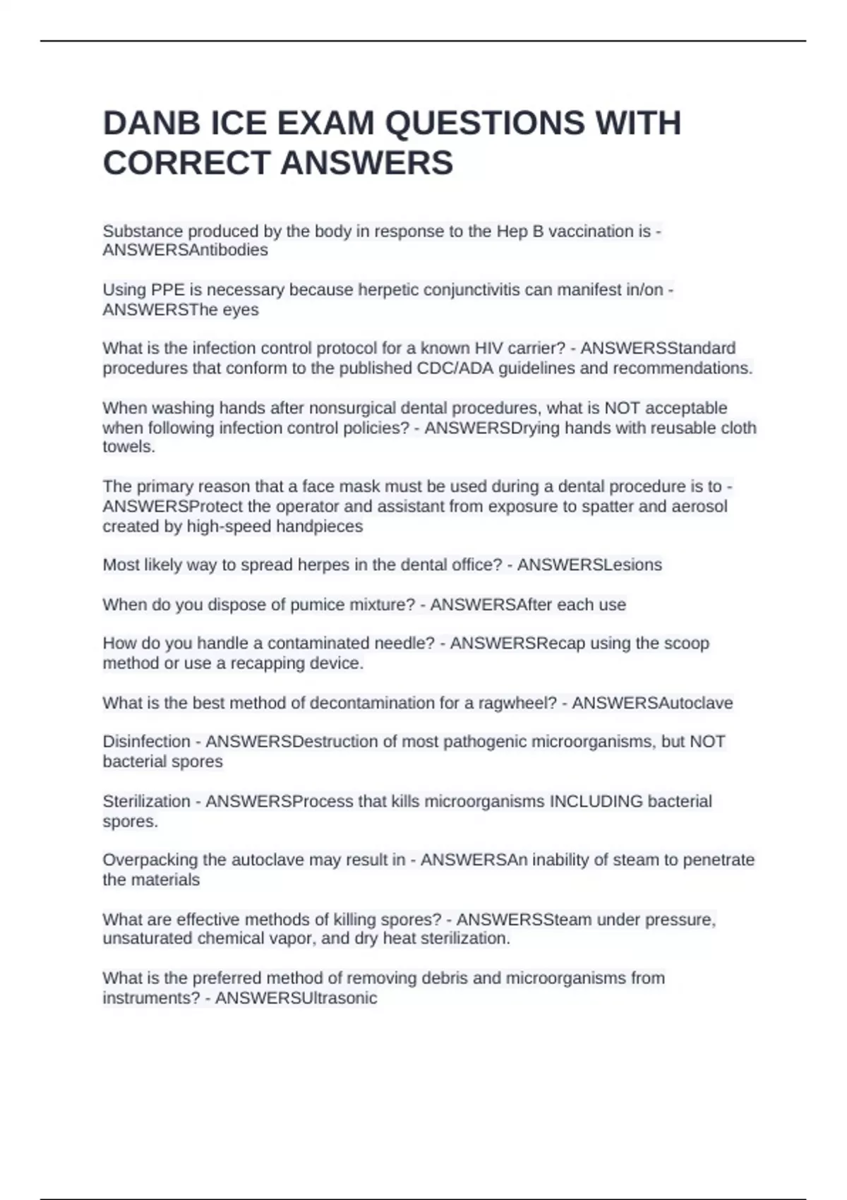 Substance produced by the body in response to the Hep B vaccination is - ANSWERSAntibodies Using PPE is necessary because herpetic conjunctivitis can manifest in/on - ANSWERSThe eyes What is the infection control protocol for a known HIV carrier? - ANSWERSStandard procedures that conform to the published CDC/ADA guidelines and recommendations. When washing hands after nonsurgical dental procedures, what is NOT acceptable when following infection control policies? - ANSWERSDrying hands with reusable cloth towels. The primary reason that a face mask must be used during a dental procedure is to - ANSWERSProtect the operator and assistant from exposure to spatter and aerosol created by high-speed handpieces Most likely way to spread herpes in the dental office? - ANSWERSLesions When do you dispose of pumice mixture? - ANSWERSAfter each use How do you handle a contaminated needle? - ANSWERSRecap using the scoop method or use a recapping device. What is the best method of decontamination for a ragwheel? - ANSWERSAutoclave Disinfection - ANSWERSDestruction of most pathogenic microorganisms, but NOT bacterial spores Sterilization - ANSWERSProcess that kills microorganisms INCLUDING bacterial spores. Overpacking the autoclave may result in - ANSWERSAn inability of steam to penetrate the materials What are effective methods of killing spores? - ANSWERSSteam under pressure, unsaturated chemical vapor, and dry heat sterilization. What is the preferred method of removing debris and microorganisms from instruments? - ANSWERSUltrasonic What mode of sterilization CANNOT be checked with spore testing? - ANSWERSImmersion in glutaraldehyde. What shows that sterilization was successful? - ANSWERSSpore testing What do you do after spraying an alginate impression with disinfectant? - ANSWERSSealed in a plastic bag Why is alcohol NOT an acceptable disinfectant? - ANSWERSIt can evaporate too quickly. Instruments prepared for chemical vapor sterilization should be - ANSWERSThoroughly dried and has adequate ventilation. When prepping sodium hypochlorite for use as a surface disinfectant, it should be - ANSWERSDiluted 1:10 to 1:100 According to OSHA Hazard Communication Standard, the employer is obligated to - ANSWERS-Ensure SDS is available for all products used in the work place that contain hazardous materials -Provide employee training in working with hazardous chemicals -Ensure that containers or hazardous chemicals are labeled as to their contents According the the OSHA BBP Standards, how often should you update the written exposure plan - ANSWERSOnce a year Lack of adequate ventilation can be harmful when mixing what products? - ANSWERSAcrylics and gypsum In uncontrolled environments, dental personal that are exposed to nitrous are most likely to exhibit an increase of what problem? - ANSWERSSpontaneous abortion Bloodborne Pathogen Standards - ANSWERSRequires employers to adopt practices and procedures that are necessary to protect workers against occupational exposure to blood or other potentially infectious material OSHA BBP Standard require employers to offer the HBV vaccination to employees within what time frame? - ANSWERS10 Days When transferring hazardous chemicals to a secondary container in the office, labeling of the second container is the responsibility of - ANSWERSThe user After amalgam restorations, where do you put remaining amalgam scraps? - ANSWERSIn a sealed, dry container that is labeled.