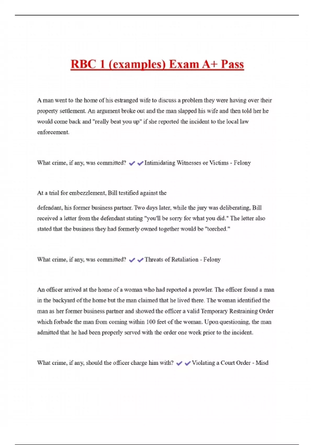 RBC 1 (examples) Exam A+ Pass A man went to the home of his estranged wife to discuss a problem they were having over their property settlement. An argument broke out and the man slapped his wife and then told her he would come back and "really beat you up" if she reported the incident to the local law enforcement. What crime, if any, was committed? Intimidating Witnesses or Victims - Felony At a trial for embezzlement, Bill testified against the defendant, his former business partner. Two days later, while the jury was deliberating, Bill received a letter from the defendant stating "you'll be sorry for what you did." The letter also stated that the business they had formerly owned together would be "torched."