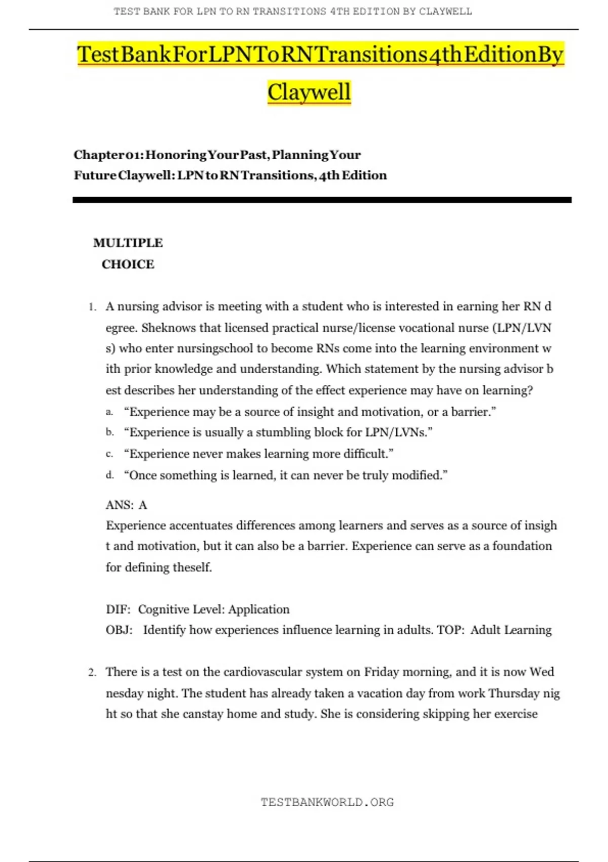 TEST BANK FOR LPN TO RN TRANSITIONS 4TH EDITION BY CLAYWELL