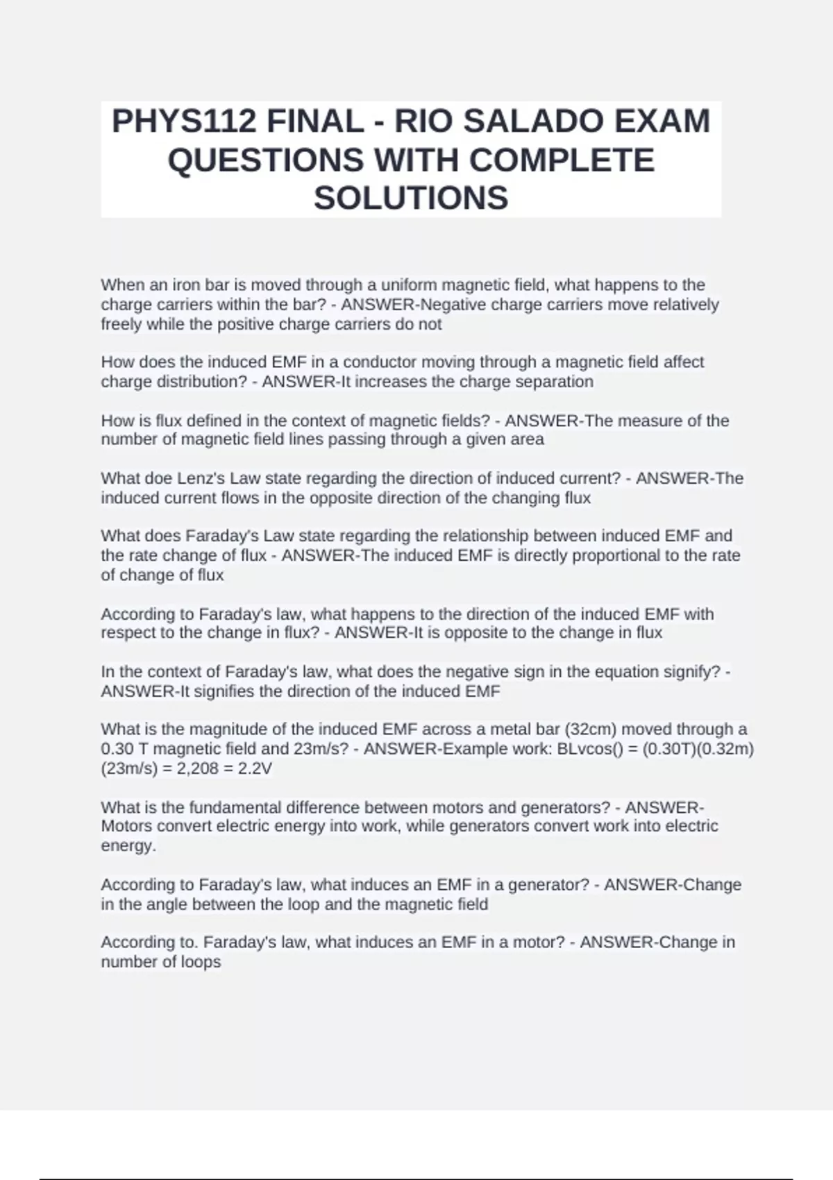 When an iron bar is moved through a uniform magnetic field, what happens to the charge carriers within the bar? - ANSWER-Negative charge carriers move relatively freely while the positive charge carriers do not How does the induced EMF in a conductor moving through a magnetic field affect charge distribution? - ANSWER-It increases the charge separation How is flux defined in the context of magnetic fields? - ANSWER-The measure of the number of magnetic field lines passing through a given area What doe Lenz's Law state regarding the direction of induced current? - ANSWER-The induced current flows in the opposite direction of the changing flux What does Faraday's Law state regarding the relationship between induced EMF and the rate change of flux - ANSWER-The induced EMF is directly proportional to the rate of change of flux According to Faraday's law, what happens to the direction of the induced EMF with respect to the change in flux? - ANSWER-It is opposite to the change in flux In the context of Faraday's law, what does the negative sign in the equation signify? - ANSWER-It signifies the direction of the induced EMF What is the magnitude of the induced EMF across a metal bar (32cm) moved through a 0.30 T magnetic field and 23m/s? - ANSWER-Example work: BLvcos() =