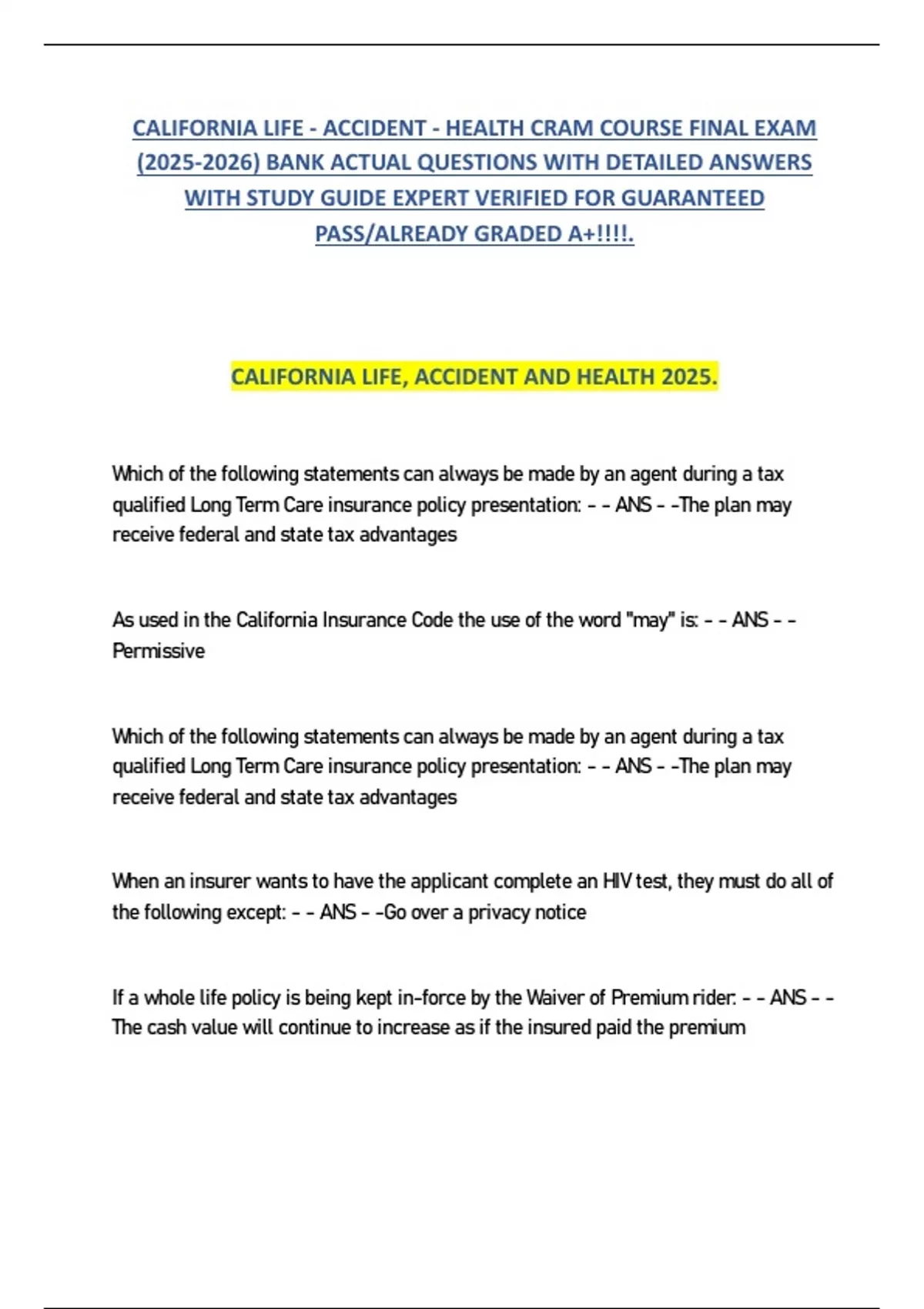 CALIFORNIA LIFE, ACCIDENT AND HEALTH 2025.