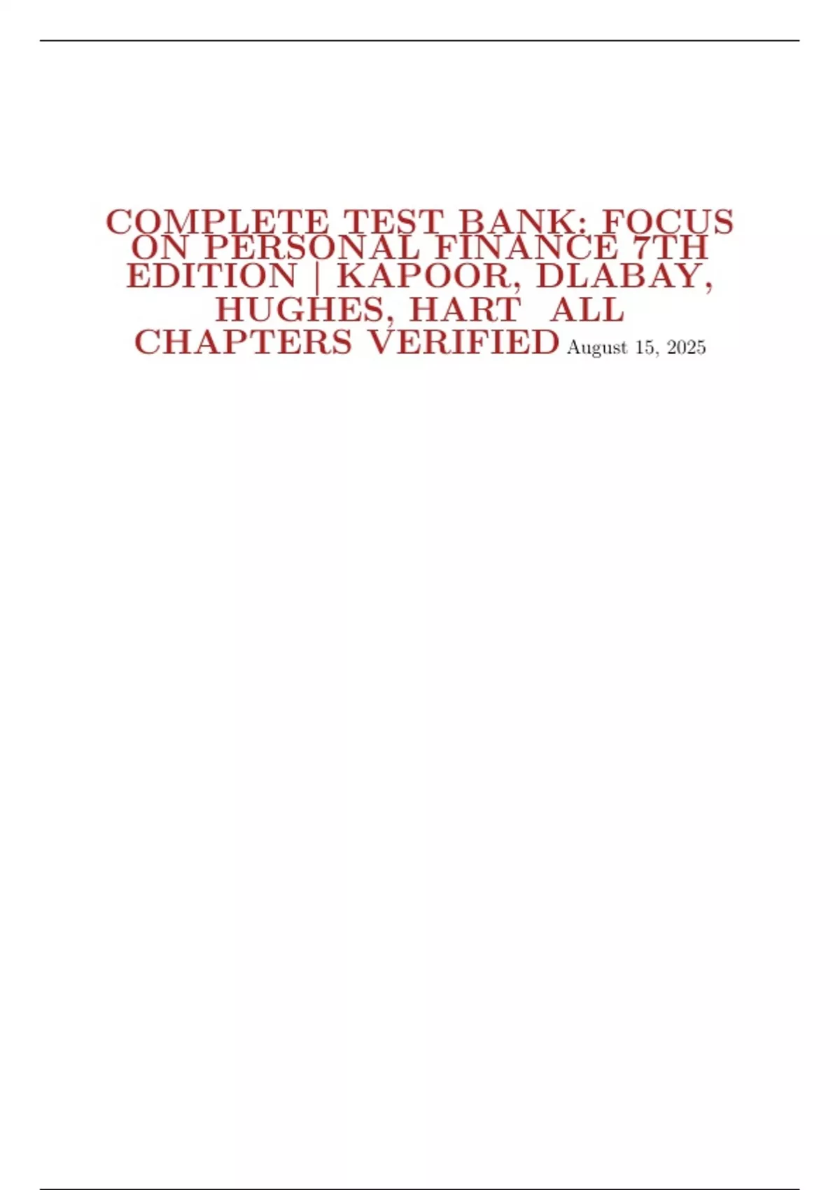 COMPLETE TEST BANK: FOCUS ON PERSONAL FINANCE 7TH EDITION | KAPOOR, DLABAY, HUGHES, HART ALL CHAPTERS VERIFIED August 15, 2025 Contents 1 Chapter 1: Personal Financial Planning in Action . . . . . . . . . . . . 2 2 Chapter 2: Money Management Skills . . . . . . . . . . . . . . . . . . . 4 3 Additional Questions on Personal Finance . . . . . . . . . . . . . . . . . 4