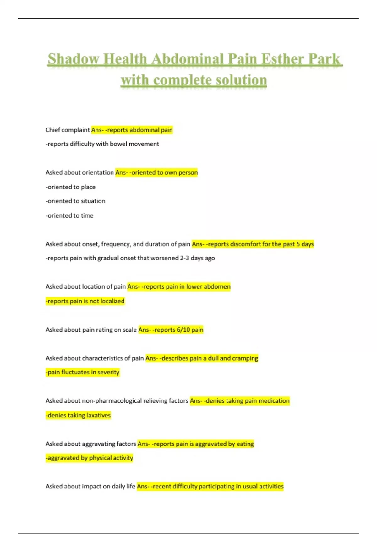 Shadow Health Abdominal Pain Esther Park with complete solution