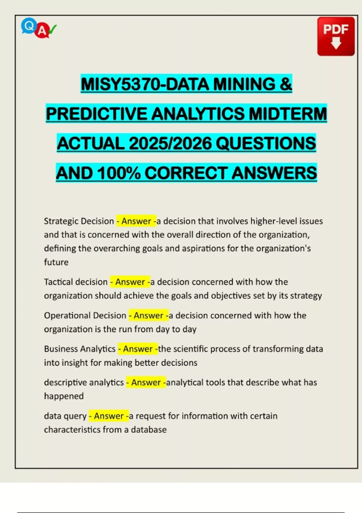 MISY5370-DATA MINING & PREDICTIVE ANALYTICS MIDTERM ACTUAL 2025/2026 QUESTIONS AND 100% CORRECT ANSWERS Strategic Decision - Answer -a decision that involves higher-level issues and that is concerned with the overall direction of the organization, defining the overarching goals and aspirations for the organization's future Tactical decision - Answer -a decision concerned with how the organization should achieve the goals and objectives set by its strategy Operational Decision - Answer -a decision concerned with how the organization is the run from day to day Business Analytics - Answer -the scientific process of transforming data into insight for making better decisions descriptive analytics - Answer -analytical tools that describe what has happened