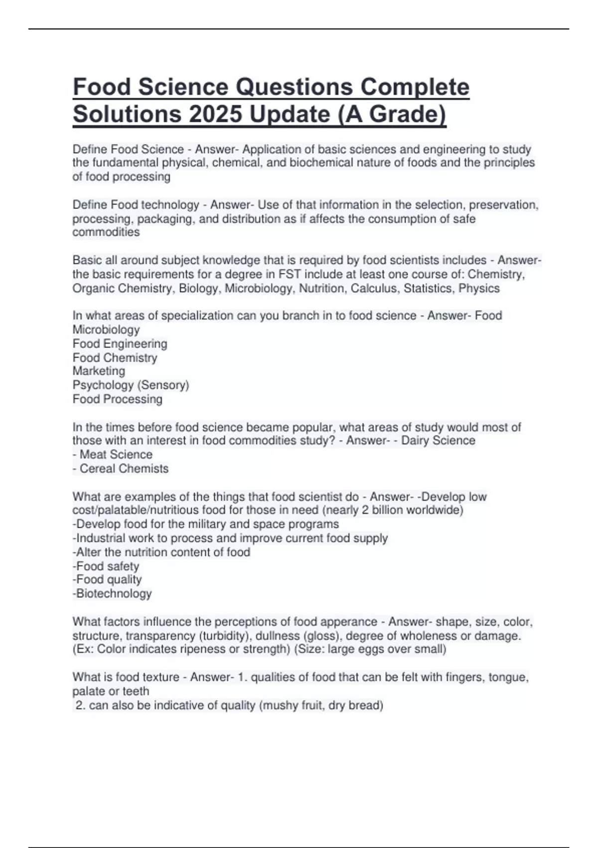Food Science Questions Complete Solutions 2025 Update (A Grade) Define Food Science - Answer- Application of basic sciences and engineering to study the fundamental physical, chemical, and biochemical nature of foods and the principles of food processing Define Food technology - Answer- Use of that information in the selection, preservation, processing, packaging, and distribution as if affects the consumption of safe commodities Basic all around subject knowledge that is required by food scientists includes - Answer- the basic requirements for a degree in FST include at least one course of: Chemistry, Organic Chemistry, Biology, Microbiology, Nutrition, Calculus, Statistics, Physics In what areas of specialization can you branch in to food science - Answer- Food Microbiology Food Engineering Food Chemistry Marketing Psychology (Sensory) Food Processing In the times before food science became popular, what areas of study would most of those with an interest in food commodities study? - Answer- - Dairy Science - Meat Science - Cereal Chemists What are examples of the things that food scientist do - Answer- -Develop low cost/palatable/nutritious food for those in need (nearly 2 billion worldwide) -Develop food for the military and space programs -Industrial work to process and improve current food supply -Alter the nutrition content of food -Food safety -Food quality -Biotechnology What factors influence the perceptions of food apperance - Answer- shape, size, color, structure, transparency (turbidity), dullness (gloss), degree of wholeness or damage. (Ex: Color indicates ripeness or strength) (Size: large eggs over small) What is food texture - Answer- 1. qualities of food that can be felt with fingers, tongue, palate or teeth 2. can also be indicative of quality (mushy fruit, dry bread) 3. RHEOLOGY: science of deformation and flow of matter (how food reacts when pressure is applied ) Define Rheology and examples - Answer- science of deformation and flow of matter Elastic: property of a solid (like a coiled spring), will it return when smushed? Viscosity: property of a liquid (resistance to flow) water is less viscous that ketchup Plastic: substance that can be molded (warm chocolate, shortening) What are some aspects of food flavor - Answer- 1. mostly subjective (taste and aroma) 2. Index of quality (old food looks and smells bad) 3. salt, sweet, sour, bitter, umami (MSG and other savory flavor enhancers) What factors can affect taste sensitivity - Answer- -depends on the length of time to taste a substance, and how concentrated it is -THRESHOLD concentration is required for identification of a substance (can vary) -temperature can affect it, hot foods generally taste stronger -Psychology can affect as well, preconceived ideas based on appearance or previous experience what is sensory tasting? - Answer- Using one or more of the senses to evaluate food -uses taste panels to sample food under controlled conditions (color, sound, temp, etc) -does not substitute for tasting by consumers explain the different tests use in sensory testing - Answer- -Triangle (identify the sample that is different) -Duo-Trio (Give a reference and identify match among two other samples) -Acceptance/Preference (general public, large numbers) -Descriptive (highly trained, small group) what is the objective food testing - Answer- -Use of physical and chemical techniques to evaluate food quality (use of equipment) -Provide routine testing of products Ex. Color difference meter, spectrophotometer, viscometers, chromatography -Tests are repeatable, not subject to human error Why is water important in food science - Answer- -Present in almost all living things, including food. -Essential for life, but no calories -Involved in most food processing techniques (freezing, drying, emulsion, gels, bread) -Important solvent and dispersing medium What is the chemical formula for water? Draw a water molecule - Answer- H2O what makes water a polar molecule? - Answer- slight positive charge on one side and a slight negative charge on the other What sort of bonds exist between the H and O atom in water? Is considered a strong bond? - Answer- Covalent; Yes What sort of bond exist between different water molecules? Is it considered a strong bond? - Answer- Hydrogen bonds; No