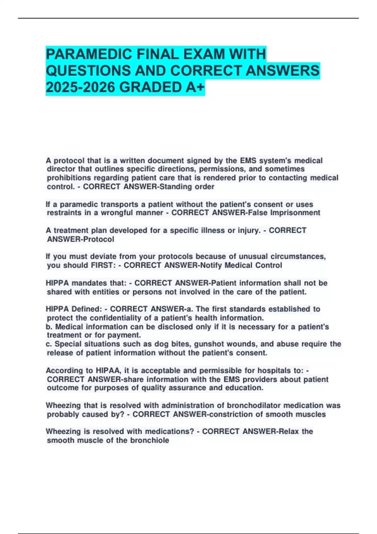 PARAMEDIC FINAL EXAM WITH QUESTIONS AND CORRECT ANSWERS GRADED A+. PARAMEDIC FINAL EXAM WITH QUESTIONS AND CORRECT ANSWERS GRADED A+.PARAMEDIC FINAL EXAM WITH QUESTIONS AND CORRECT ANSWERS GRADED A+.PARAMEDIC FINAL EXAM WITH QUESTIONS AND CORRECT ANSWERS GRADED A+.