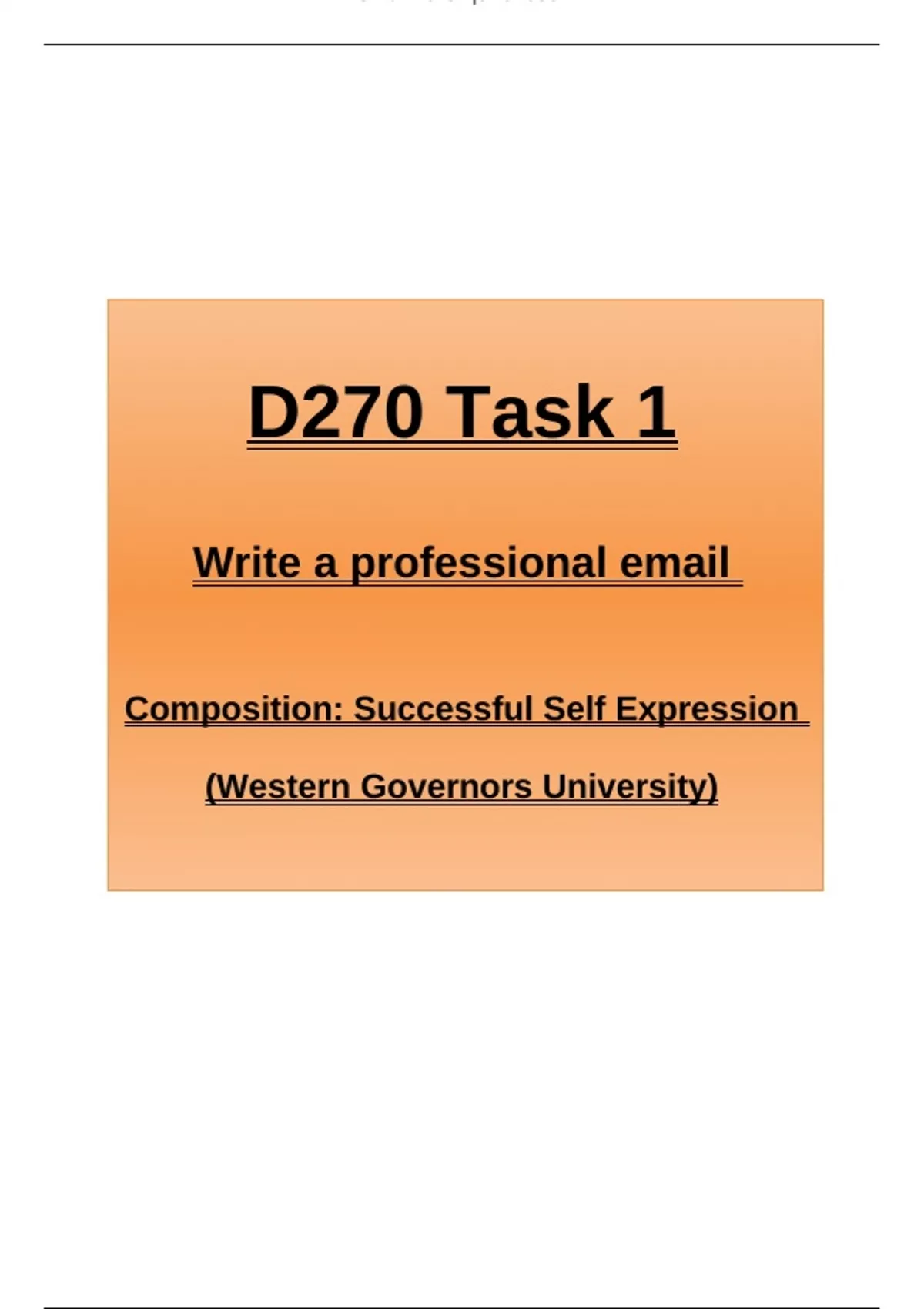 INSTANT DOWNLOAD PDF – This document contains a completed and passed submission for *D270 Task 1: Composition – Successful Self-Expression* at Western Governors University (WGU). The task demonstrates effective communication through a professional email, with appropriate tone, structure, and clarity for an academic or workplace audience. A helpful model for WGU students completing Task 1 of the D270 course. D270 Task 1 WGU, WGU professional email example, composition successful self-expression, D270 passed assignment, Western Governors University D270, professional writing task WGU, D270 email writing guide, WGU academic writing example, clear communication email, Task 1 D270 template