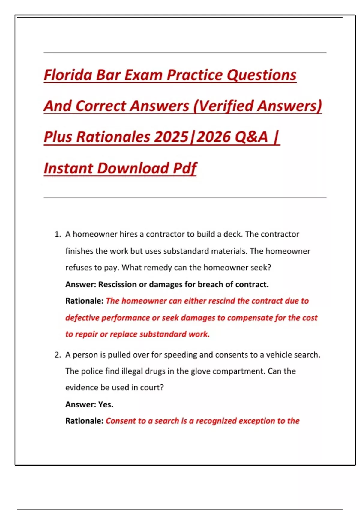 Florida Bar Exam Practice Questions And Correct Answers (Verified Answers) Plus Rationales 2025|2026 Q&A | Instant Download Pdf