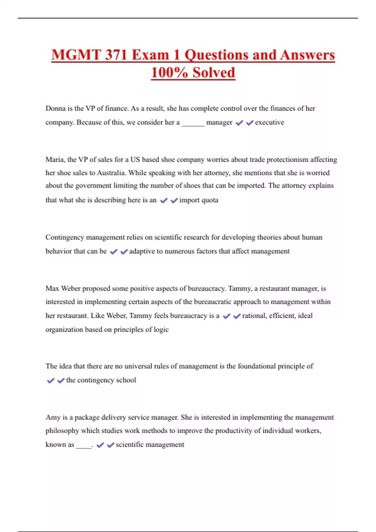 MGMT 371 Exam 1 Questions and Answers 100% Solved Donna is the VP of finance. As a result, she has complete control over the finances of her company. Because of this, we consider her a ______ manager executive Maria, the VP of sales for a US based shoe company worries about trade protectionism affecting her shoe sales to Australia. While speaking with her attorney, she mentions that she is worried about the government limiting the number of shoes that can be imported. The attorney explains that what she is describing here is an import quota Contingency management relies on scientific research for developing theories about human behavior that can be adaptive to numerous factors that affect management