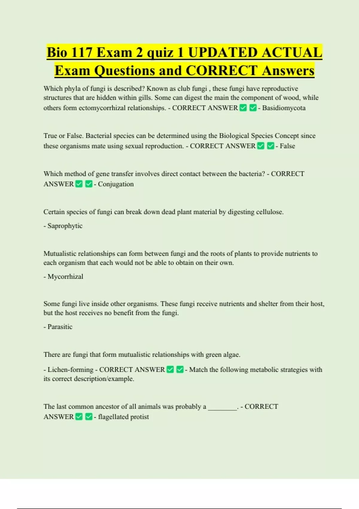 Bio 117 Exam 2 quiz 1 UPDATED ACTUAL Exam Questions and CORRECT Answers Which phyla of fungi is described? Known as club fungi , these fungi have reproductive structures that are hidden within gills. Some can digest the main the component of wood, while others form ectomycorrhizal relationships. - CORRECT ANSWER - Basidiomycota True or False. Bacterial species can be determined using the Biological Species Concept since these organisms mate using sexual reproduction. - CORRECT ANSWER - False Which method of gene transfer involves direct contact between the bacteria? - CORRECT ANSWER - Conjugatio
