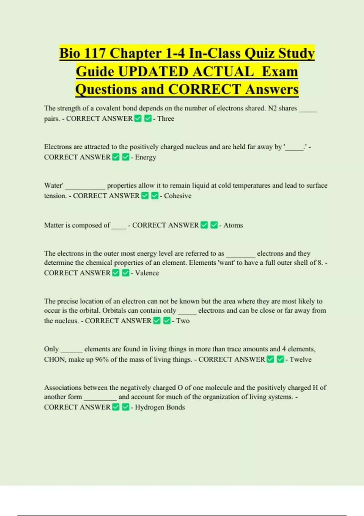 Bio 117 Chapter 1-4 In-Class Quiz Study Guide UPDATED ACTUAL Exam Questions and CORRECT Answers The strength of a covalent bond depends on the number of electrons shared. N2 shares _____ pairs. - CORRECT ANSWER - Three Electrons are attracted to the positively charged nucleus and are held far away by '_____.' - CORRECT ANSWER - Energy Water' ___________ properties allow it to remain liquid at cold temperatures and lead to surface tension. - CORRECT ANSWER - Cohesive