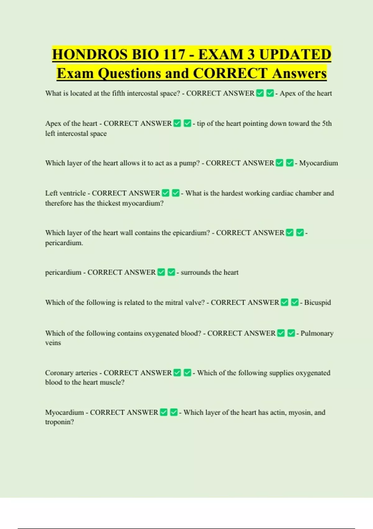 HONDROS BIO 117 - EXAM 3 UPDATED Exam Questions and CORRECT Answers What is located at the fifth intercostal space? - CORRECT ANSWER Apex of the heart - CORRECT ANSWER - Apex of the heart - tip of the heart pointing down toward the 5th left intercostal space Which layer of the heart allows it to act as a pump? - CORRECT ANSWER Left ventricle - CORRECT ANSWER - Myocardium - What is the hardest working cardiac chamber and therefore has the thickest myocardium
