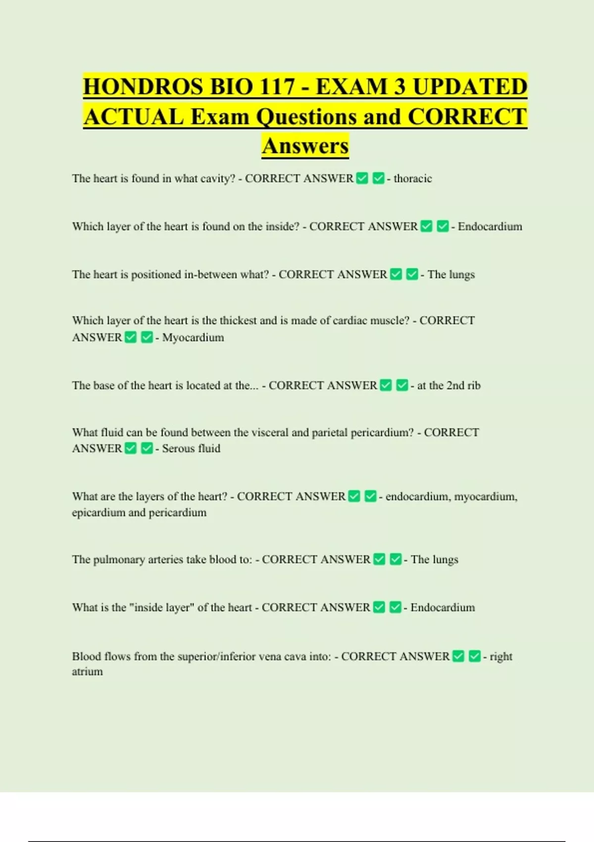 HONDROS BIO 117 - EXAM 3 UPDATED ACTUAL Exam Questions and CORRECT Answers The heart is found in what cavity? - CORRECT ANSWER - thoracic Which layer of the heart is found on the inside? - CORRECT ANSWER The heart is positioned in-between what? - CORRECT ANSWER - Endocardium - The lungs Which layer of the heart is the thickest and is made of cardiac muscle? - CORRECT ANSWER - Myocardium