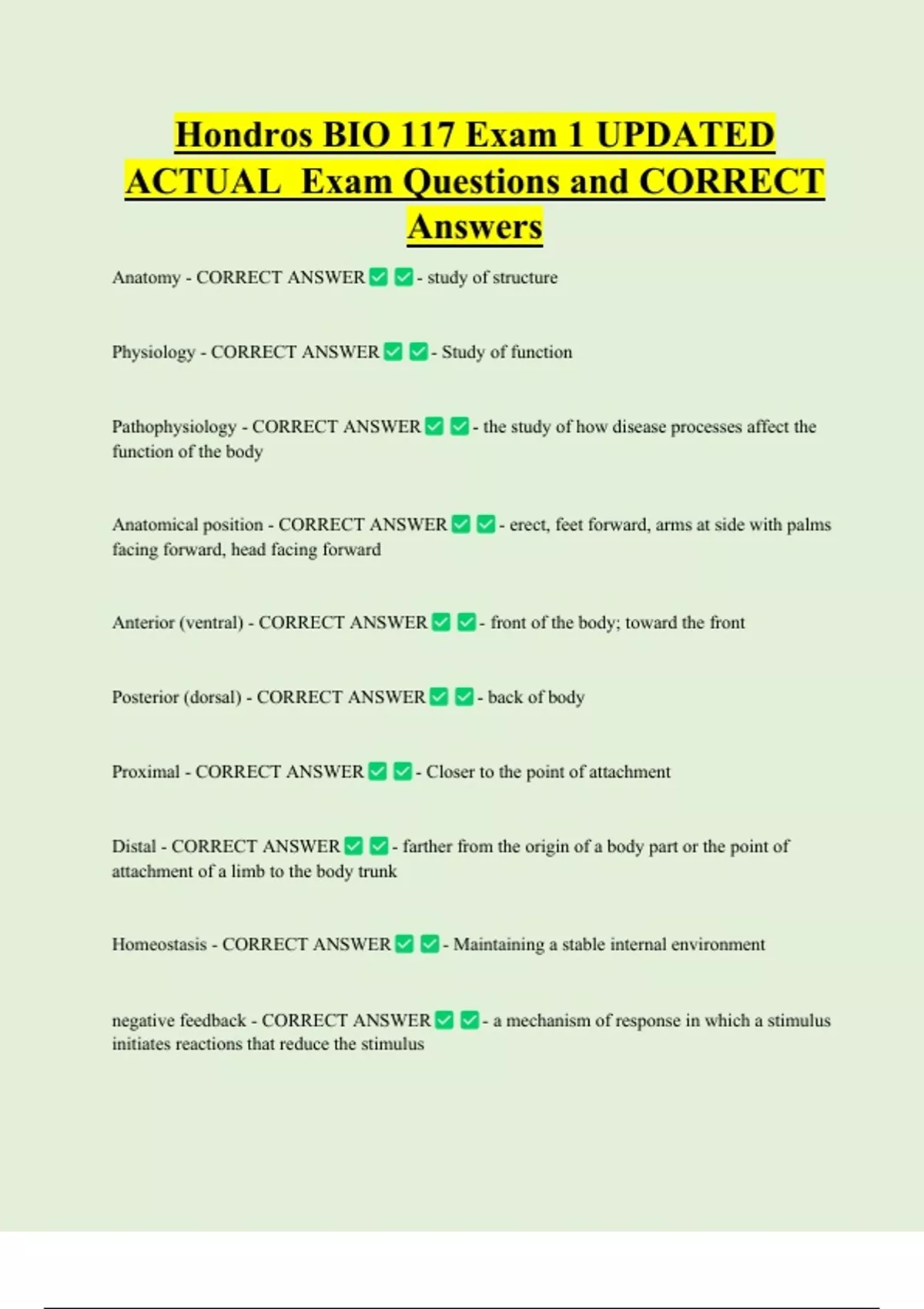 Hondros BIO 117 Exam 1 UPDATED ACTUAL Exam Questions and CORRECT Answers Anatomy - CORRECT ANSWER Physiology - CORRECT ANSWER - study of structure - Study of function Pathophysiology - CORRECT ANSWER function of the body Anatomical position - CORRECT ANSWER facing forward, head facing forward Anterior (ventral) - CORRECT ANSWER Posterior (dorsal) - CORRECT ANSWER Proximal - CORRECT ANSWER - the study of how disease processes affect the - erect, feet forward, arms at side with palms