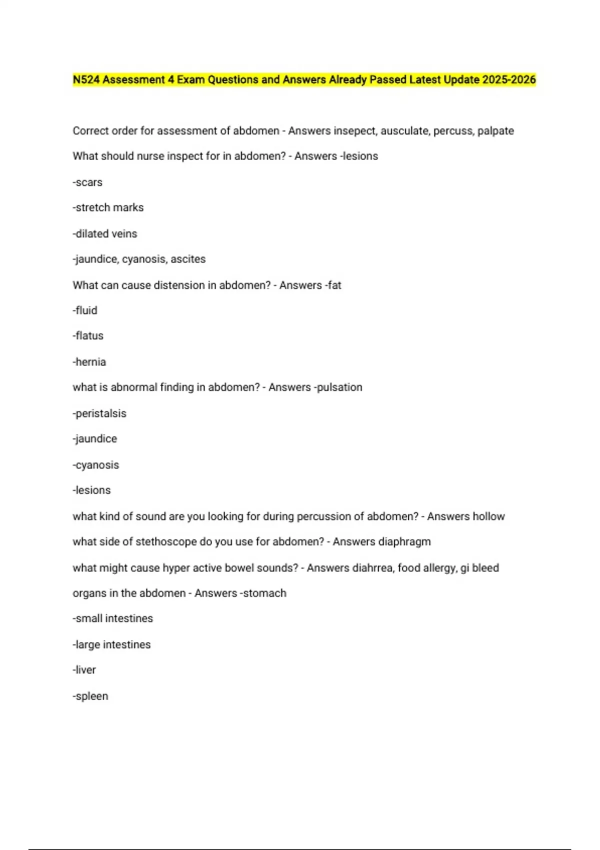 Correct order for assessment of abdomen - Answers insepect, ausculate, percuss, palpate