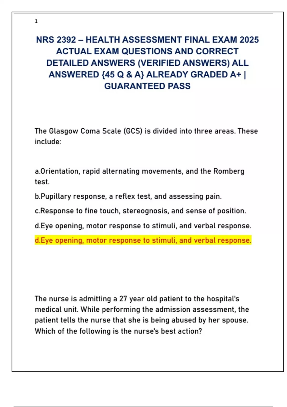 NRS 2392 – HEALTH ASSESSMENT FINAL EXAM 2025 ACTUAL EXAM QUESTIONS AND CORRECT DETAILED ANSWERS (VERIFIED ANSWERS) ALL ANSWERED {45 Q & A} ALREADY GRADED A+ | GUARANTEED PASS The Glasgow Coma Scale (GCS) is divided into three areas. These include: a.Orientation, rapid alternating movements, and the Romberg test. b.Pupillary response, a reflex test, and assessing pain. c.Response to fine touch, stereognosis, and sense of position. d.Eye opening, motor response to stimuli, and verbal response. d.Eye opening, motor response to stimuli, and verbal response.