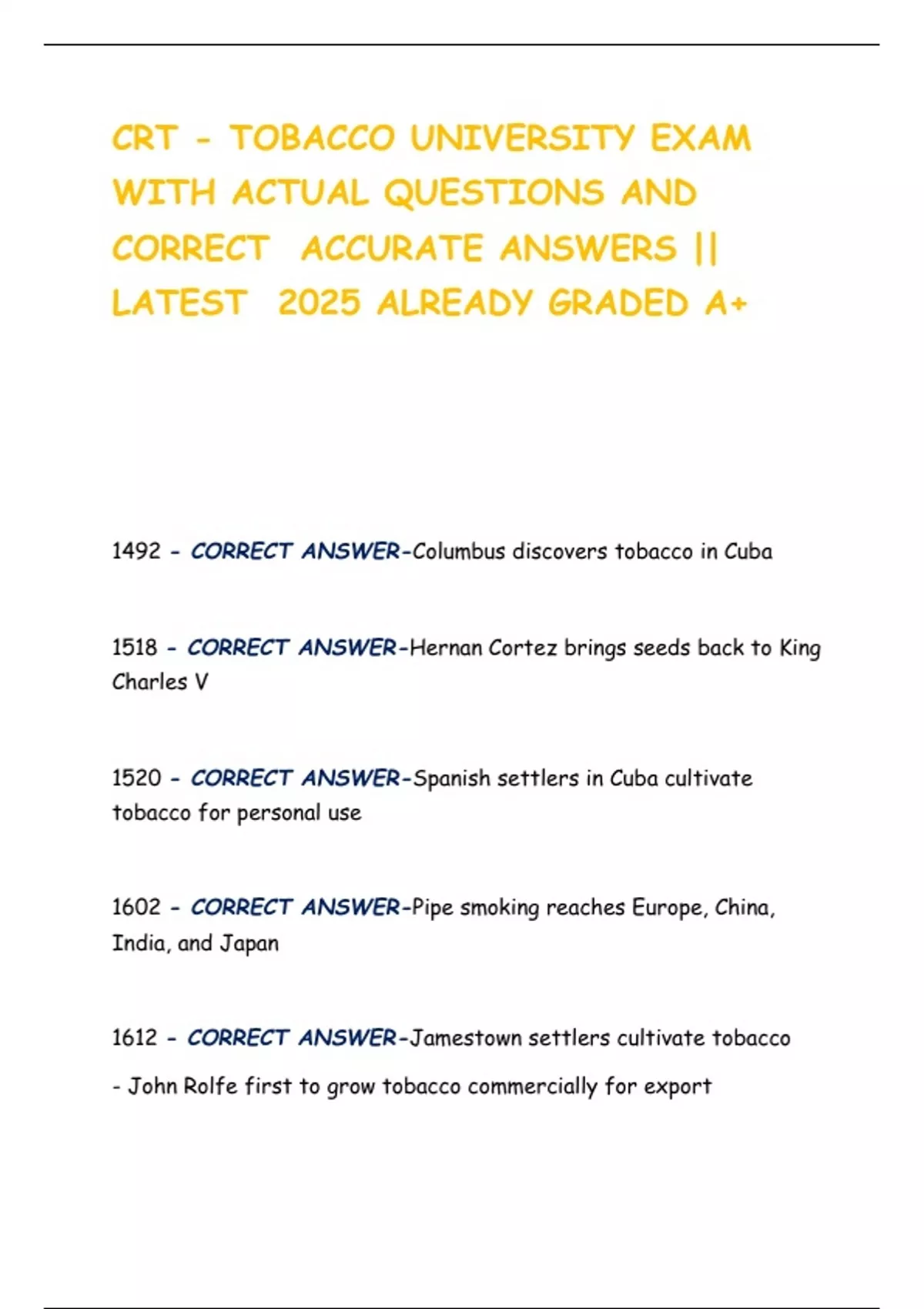 1492 - CORRECT ANSWER-Columbus discovers tobacco in Cuba
