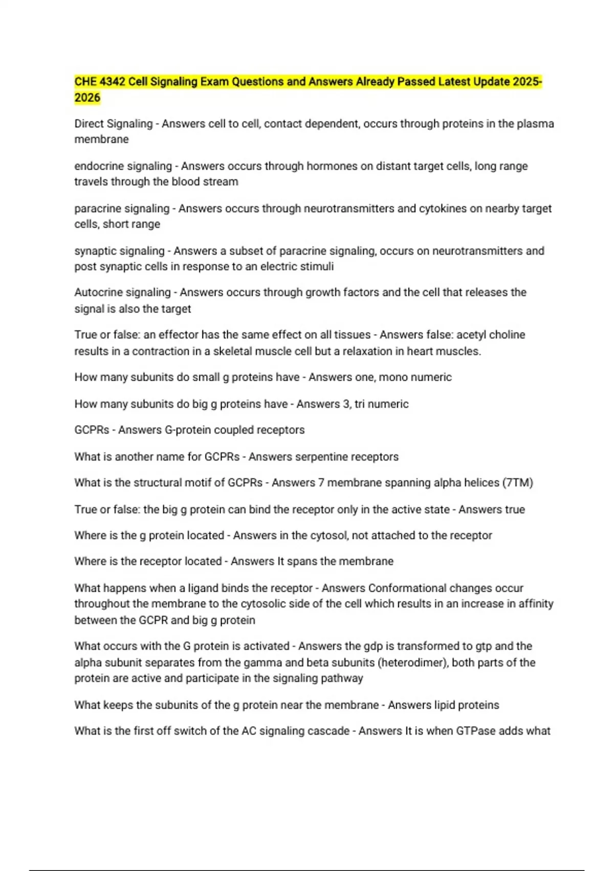 CHE 4342 Cell Signaling Exam Questions and Answers Already Passed Latest Update Direct Signaling - Answers cell to cell, contact dependent, occurs through proteins in the plasma membrane endocrine signaling - Answers occurs through hormones on distant target cells, long range travels through the blood stream paracrine signaling - Answers occurs through neurotransmitters and cytokines on nearby target cells, short range synaptic signaling - Answers a subset of paracrine signaling, occurs on neurotransmitters and post synaptic cells in response to an electric stimuli Autocrine signaling - Answers occurs through growth factors and the cell that releases the signal is also the target True or false: an effector has the same effect on all tissues - Answers false: acetyl choline results in a contraction in a skeletal muscle cell but a relaxation in heart muscles. How many subunits do small g proteins have - Answers one, mono numeric How many subunits do big g proteins have - Answers 3, tri numeric GCPRs - Answers G-protein coupled receptors What is another name for GCPRs - Answers serpentine receptors What is the structural motif of GCPRs - Answers 7 membrane spanning alpha helices (7TM) True or false: the big g protein can bind the receptor only in the active state - Answers true Where is the g protein located - Answers in the cytosol, not attached to the receptor Where is the receptor located - Answers It spans the membrane What happens when a ligand binds the receptor - Answers Conformational changes occur throughout the membrane to the cytosolic side of the cell which results in an increase in affinity between the GCPR and big g protein What occurs with the G protein is activated - Answers the gdp is transformed to gtp and the alpha subunit separates from the gamma and beta subunits (heterodimer), both parts of the protein are active and participate in the signaling pathway What keeps the subunits of the g protein near the membrane - Answers lipid proteins What is the first off switch of the AC signaling cascade - Answers It is when GTPase adds what across the alpha subunit which turns GTP into GDP, stopping the signaling cascade. What is GTPase activity enhanced by - Answers auxillary proteins True or false: you only need one off switch to stop a signaling cascade - Answers false Isoform - Answers homologous g proteins that impact different signaling cascades or target proteins. What is the second messenger of the adenylyl cyclase cascade - Answers cAMP (made from ATP) What enzyme turns ATP into cAMP? - Answers PPI (pyrophospate)