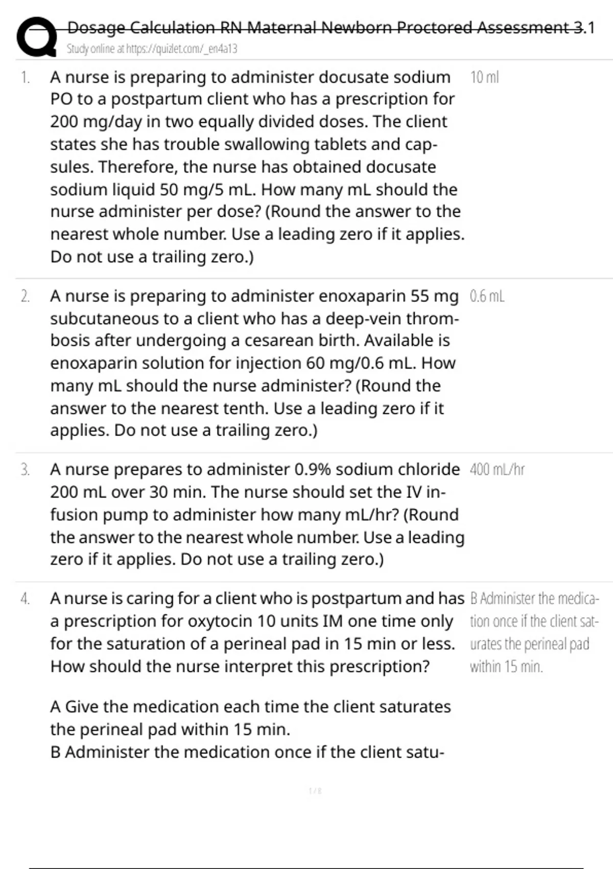, Dosage Calculation RN Maternal Newborn Proctored Assessment 3.1