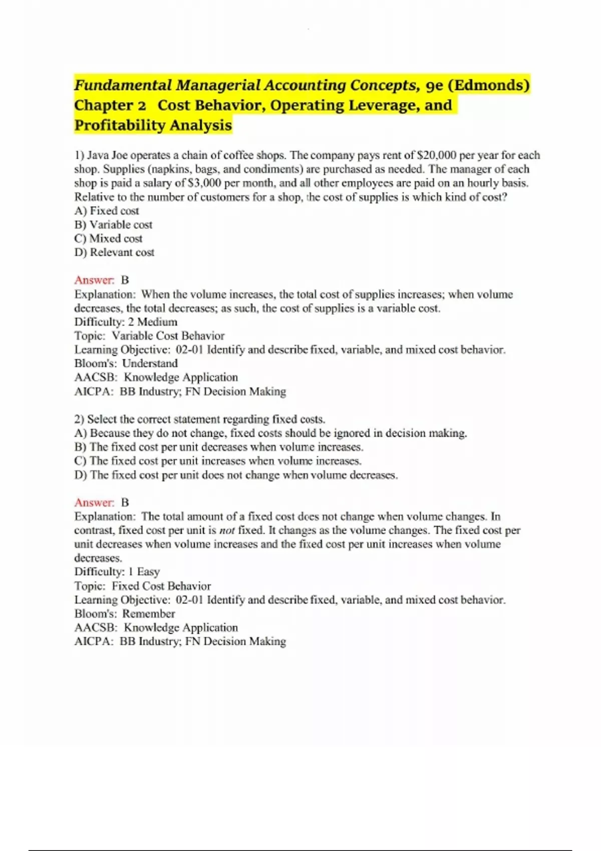 Test Bank For Fundamental Managerial Accounting Concepts 9th Edition Edmonds Ch, update!!