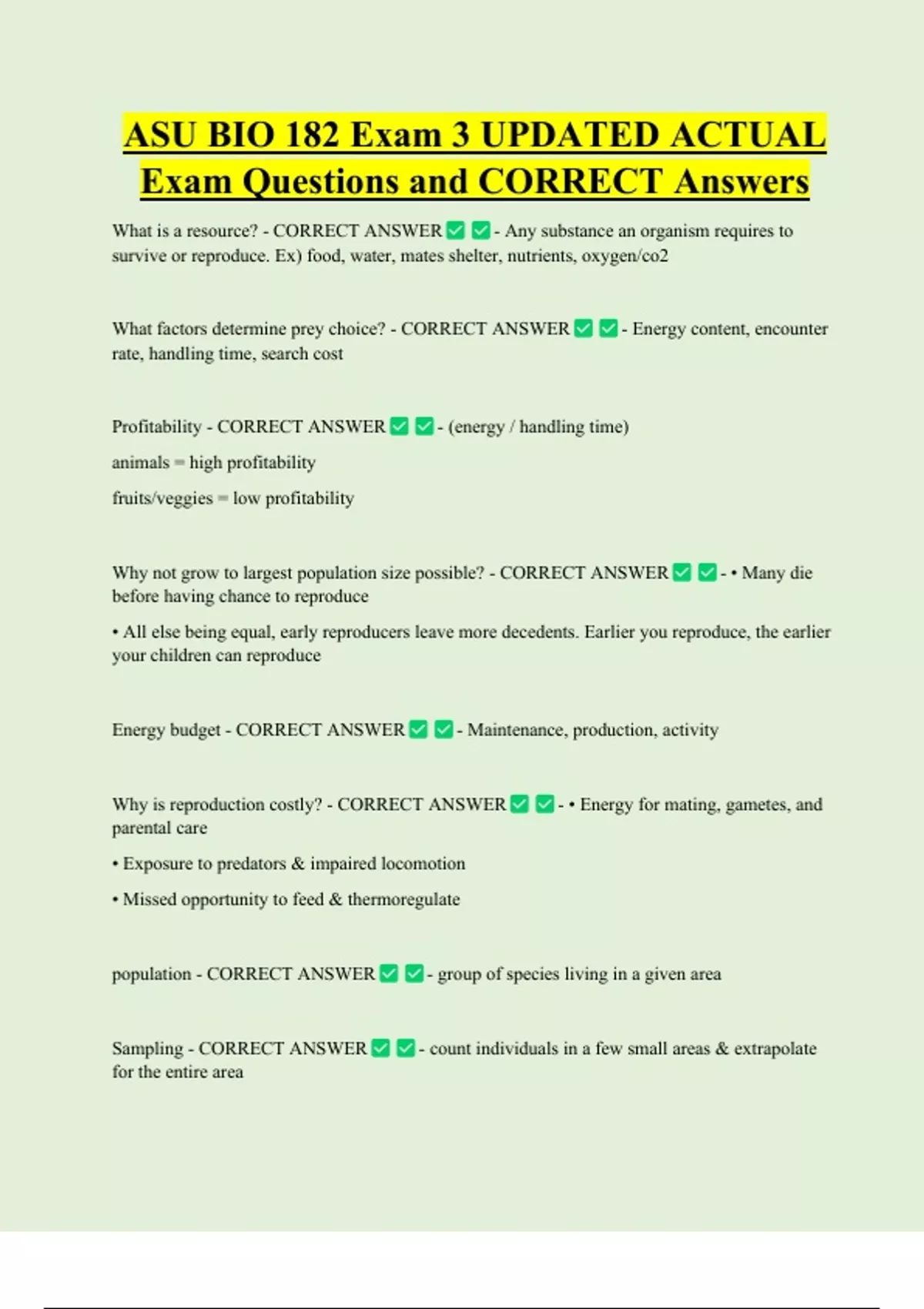 ASU BIO 182 Exam 3 UPDATED ACTUAL Exam Questions and CORRECT Answers What is a resource? - CORRECT ANSWER - Any substance an organism requires to survive or reproduce. Ex) food, water, mates shelter, nutrients, oxygen/co2 What factors determine prey choice? - CORRECT ANSWER rate, handling time, search cost Profitability - CORRECT ANSWER - Energy content, encounter - (energy / handling time)