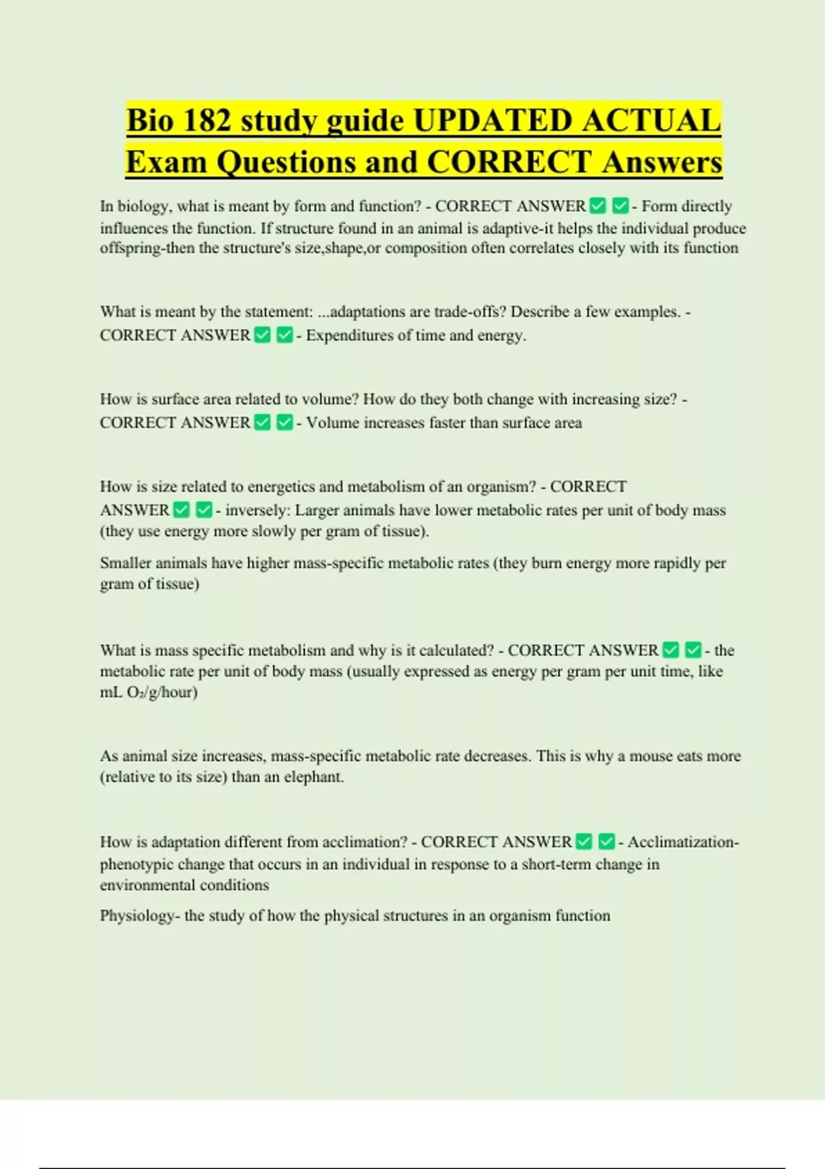 Bio 182 study guide UPDATED ACTUAL Exam Questions and CORRECT Answers In biology, what is meant by form and function? - CORRECT ANSWER - Form directly influences the function. If structure found in an animal is adaptive-it helps the individual produce offspring-then the structure's size,shape,or composition often correlates closely with its function What is meant by the statement: ...adaptations are trade-offs? Describe a few examples. - CORRECT ANSWER - Expenditures of time and energy. How is surface area related to volume? How do they both change with increasing size? - CORRECT ANSWER - Volume increases faster than surface are
