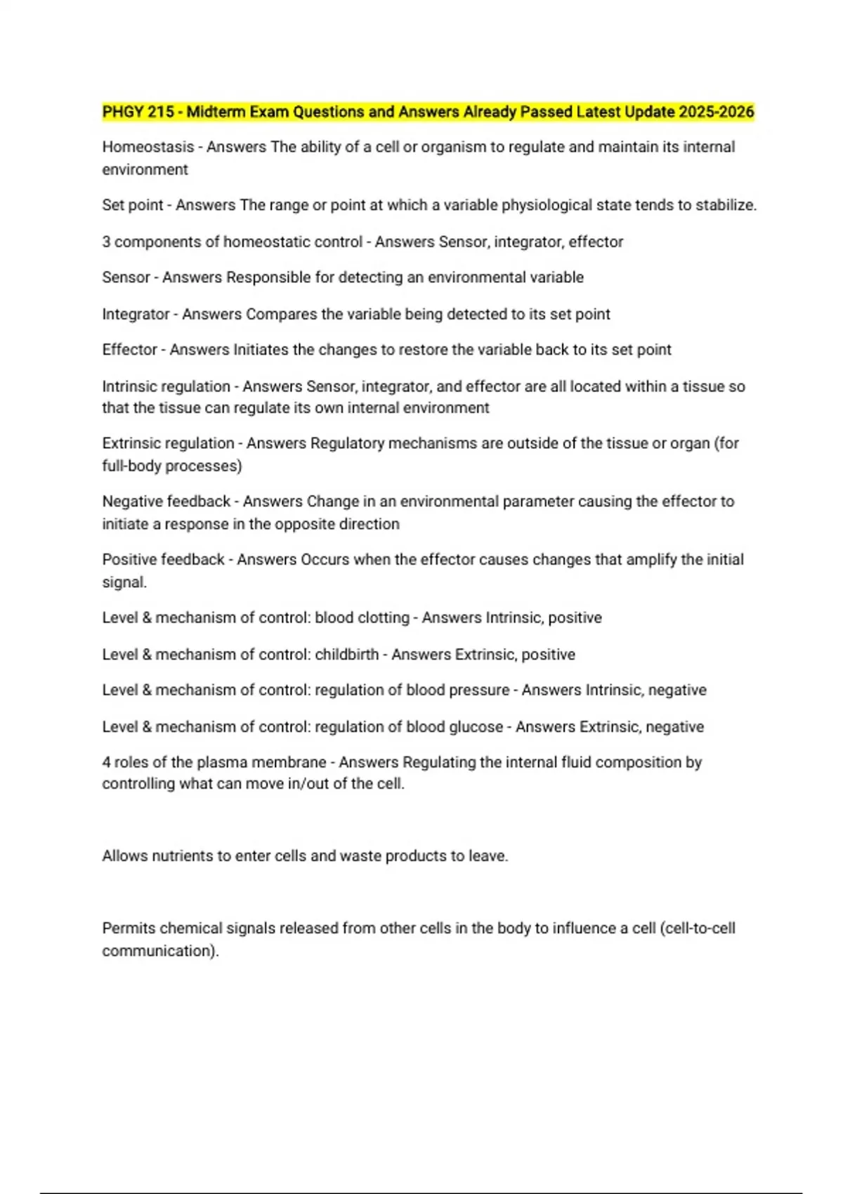 PHGY 215 - Midterm Exam Questions and Answers Already Passed Latest Update Homeostasis - Answers The ability of a cell or organism to regulate and maintain its internal environment Set point - Answers The range or point at which a variable physiological state tends to stabilize. 3 components of homeostatic control - Answers Sensor, integrator, effector Sensor - Answers Responsible for detecting an environmental variable Integrator - Answers Compares the variable being detected to its set point Effector - Answers Initiates the changes to restore the variable back to its set point Intrinsic regulation - Answers Sensor, integrator, and effector are all located within a tissue so that the tissue can regulate its own internal environment Extrinsic regulation - Answers Regulatory mechanisms are outside of the tissue or organ (for full-body processes) Negative feedback - Answers Change in an environmental parameter causing the effector to initiate a response in the opposite direction Positive feedback - Answers Occurs when the effector causes changes that amplify the initial signal. Level & mechanism of control: blood clotting - Answers Intrinsic, positive Level & mechanism of control: childbirth - Answers Extrinsic, positive Level & mechanism of control: regulation of blood pressure - Answers Intrinsic, negative Level & mechanism of control: regulation of blood glucose - Answers Extrinsic, negative 4 roles of the plasma membrane - Answers Regulating the internal fluid composition by controlling what can move in/out of the cell. Allows nutrients to enter cells and waste products to leave. Permits chemical signals released from other cells in the body to influence a cell (cell-to-cell communication). Participates in joining cells together, to form tissues & organs. 3 primary functions of the plasma membrane - Answers Ensure the cell's survival Maintain homeostasis Function cooperatively and in coordination with surrounding cells Structures present in the plasma membrane - Answers Phospholipids, cholesterol, membrane proteins, ion channels, carbohydrate chains Phospholipids - Answers Lipid bilayer is comprised of phospholipids.