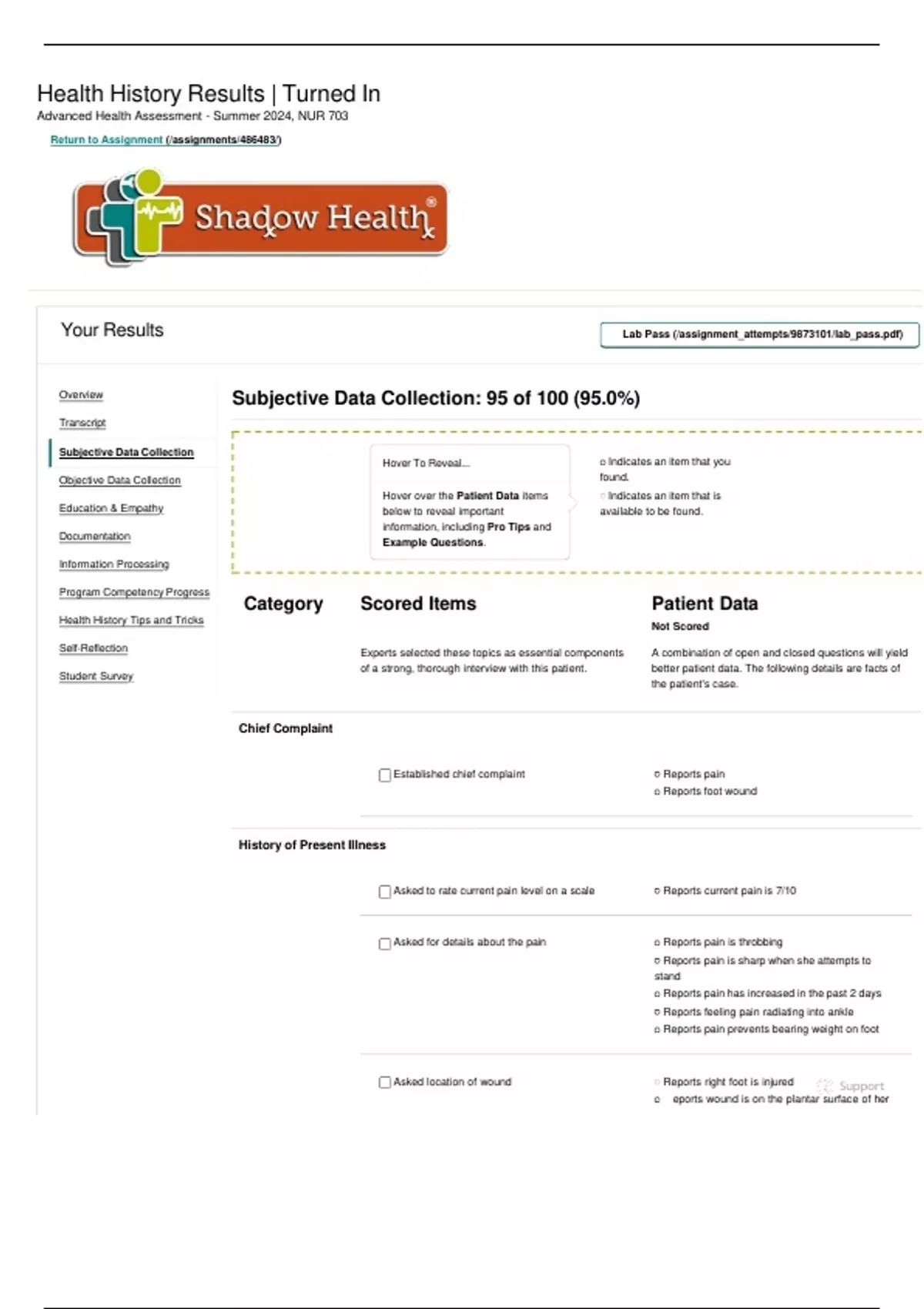 Explored impact of patient's foot injury on Reports pain affects ability to walk