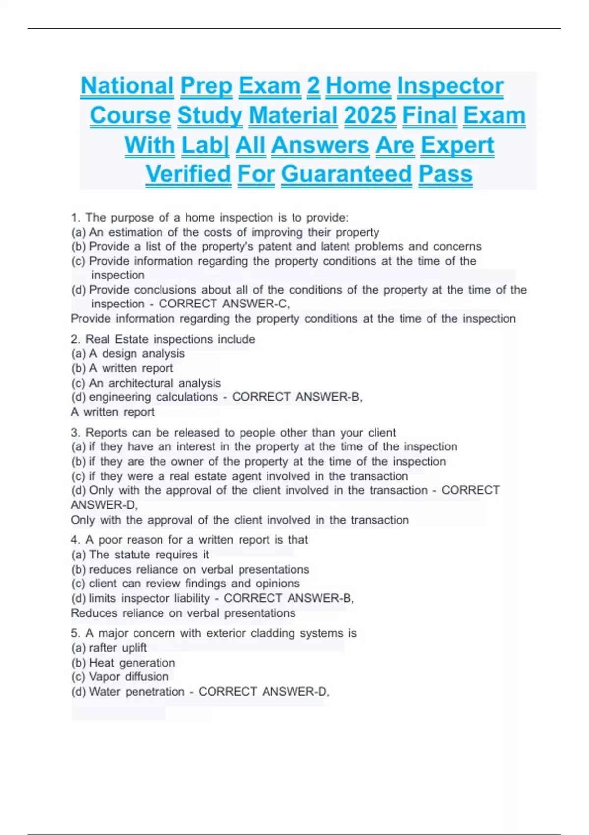 National Prep Exam 2 Home Inspector Course Study Material 2025 Final Exam With Lab| All Answers Are Expert Verified For Guaranteed Pass