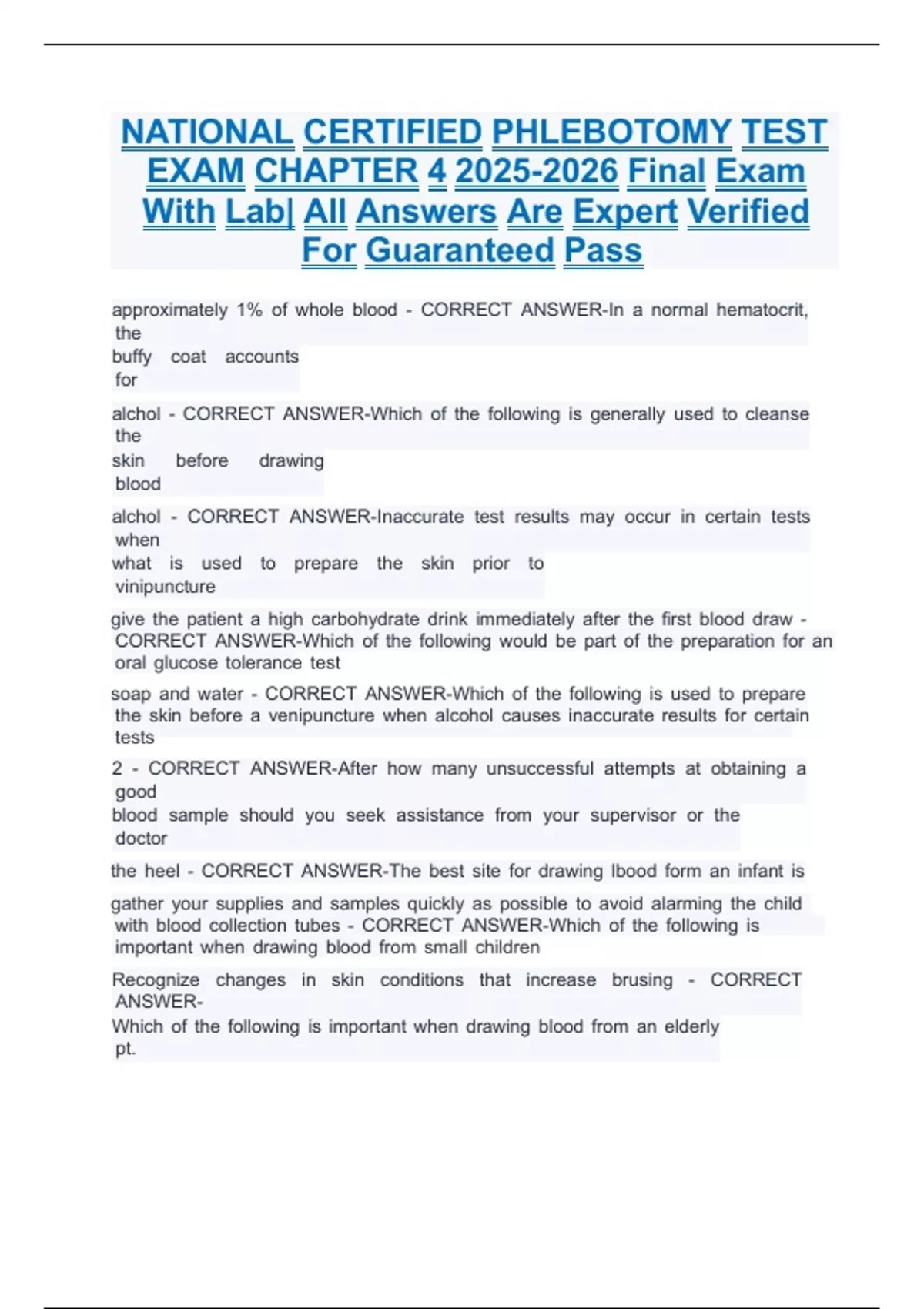 NATIONAL CERTIFIED PHLEBOTOMY TEST EXAM CHAPTER final exam with lab| all answers are expert verified for guaranteed passNATIONAL CERTIFIED PHLEBOTOMY TEST EXAM CHAPTER final exam with lab| all answers are expert verified for guaranteed passNATIONAL CERTIFIED PHLEBOTOMY TEST EXAM CHAPTER final exam with lab| all answers are expert verified for guaranteed passNATIONAL CERTIFIED PHLEBOTOMY TEST EXAM CHAPTER final exam with lab| all answers are expert verified for guaranteed passNATIONAL CERTIFIED PHLEBOTOMY TEST EXAM CHAPTER final exam with lab| all answers are expert verified for guaranteed pass
