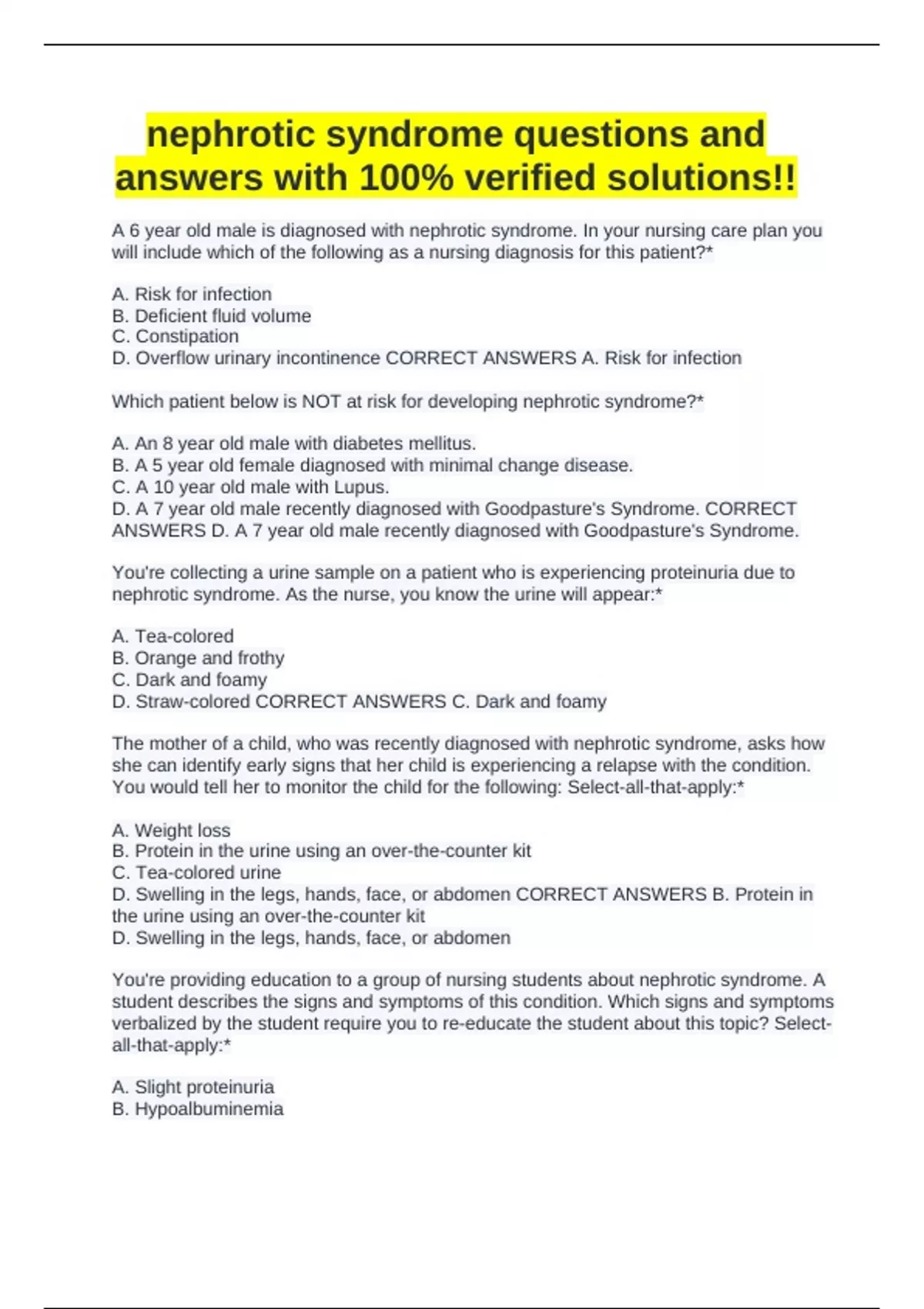 nephrotic syndrome questions and answers with 100% verified solutions!!