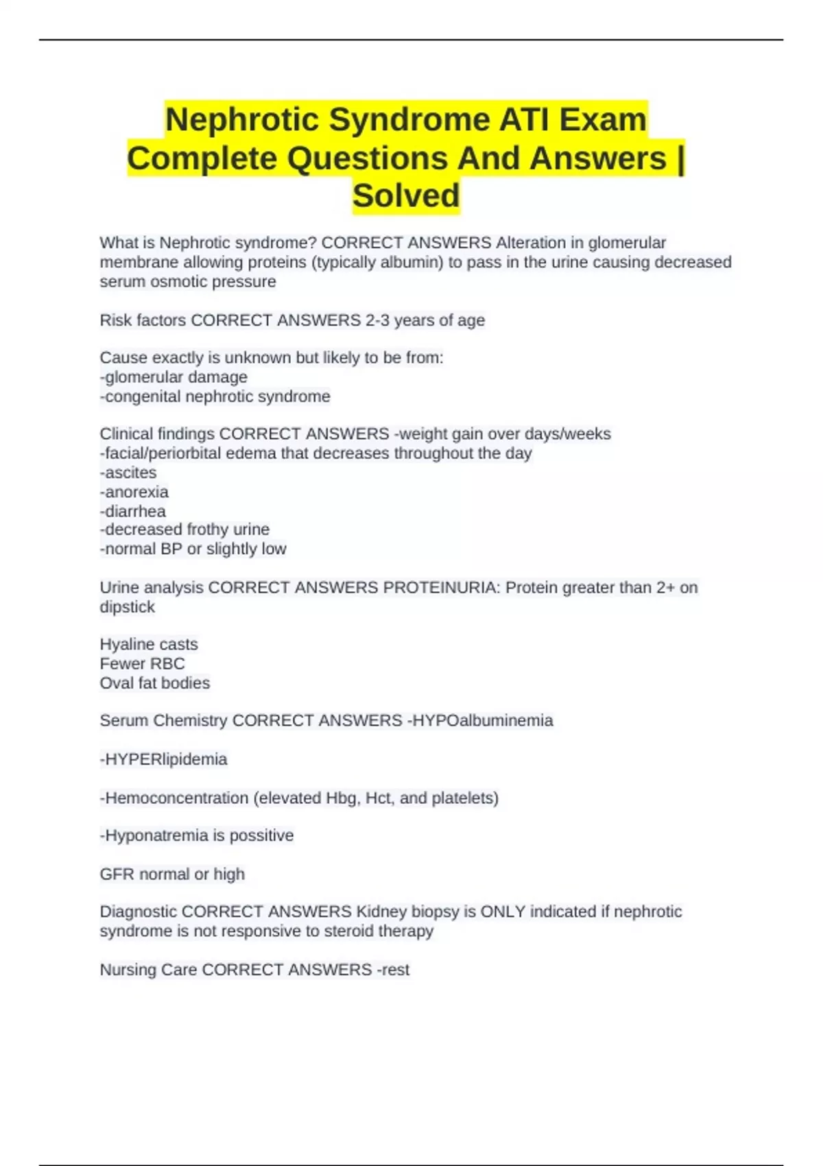 Nephrotic Syndrome ATI Exam Complete Questions And Answers | Solved