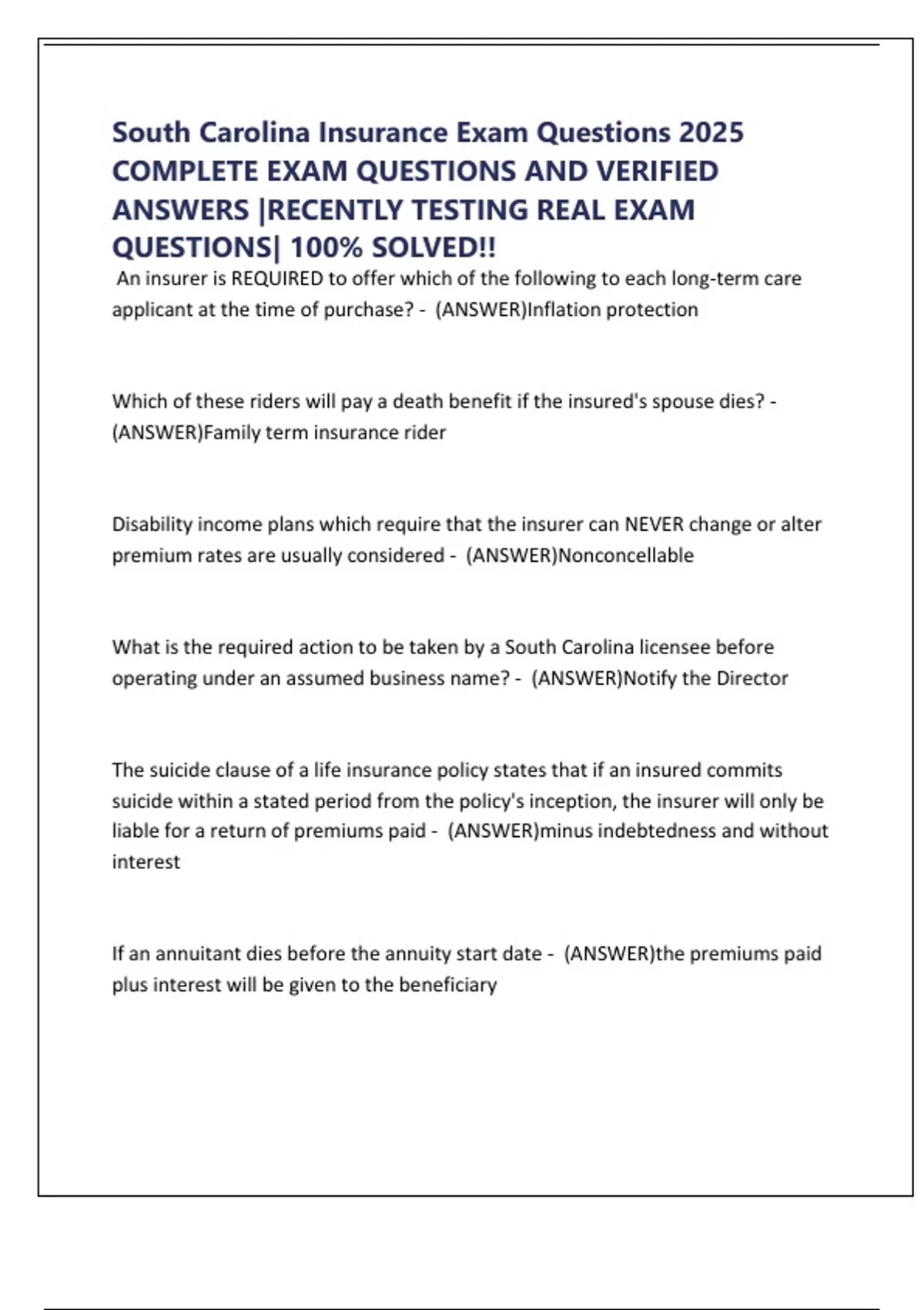South Carolina Insurance Exam Questions 2025