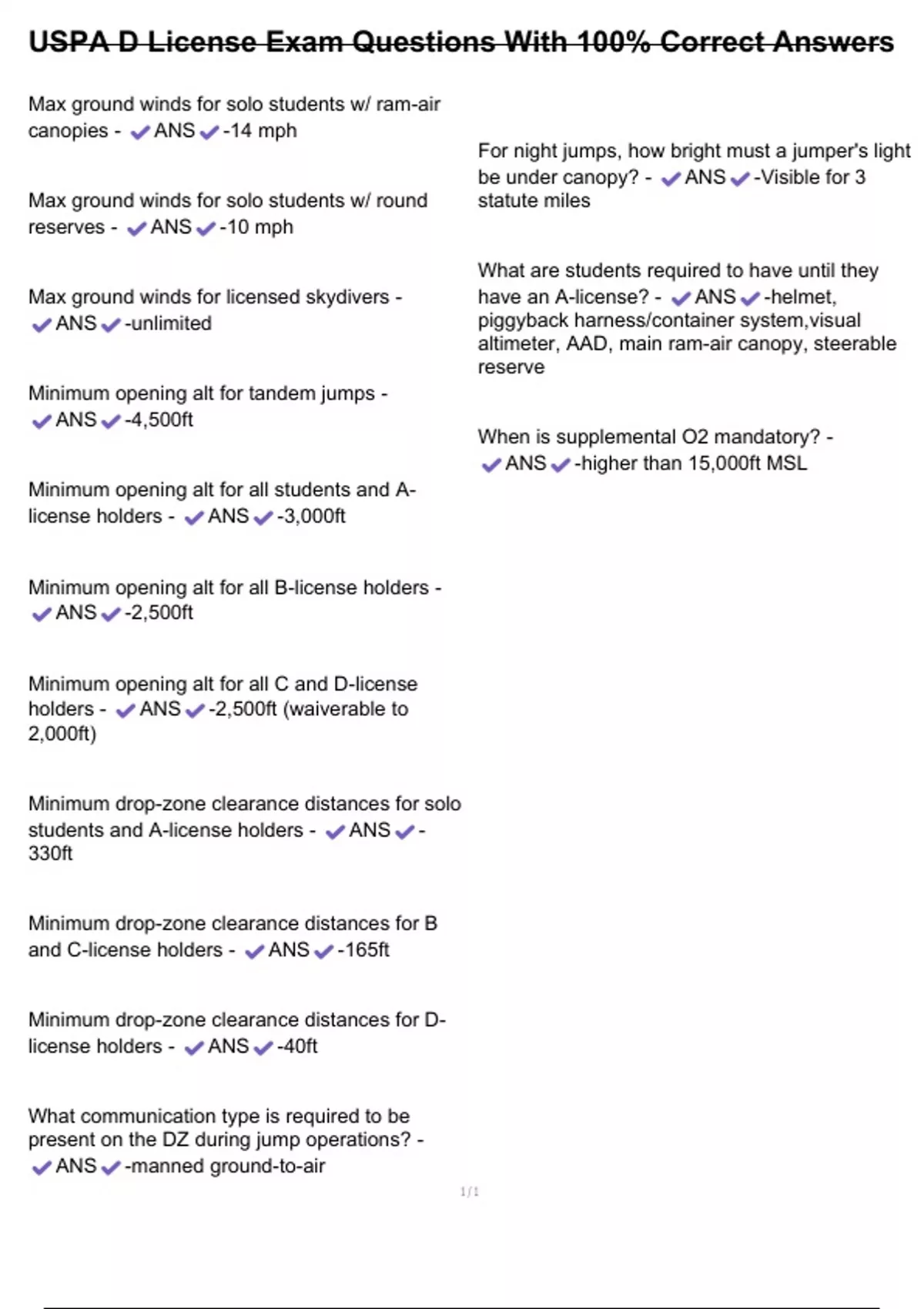 Max ground winds for solo students w/ ram-air canopies - ANS -14 mph Max ground winds for solo students w/ round reserves - ANS -10 mph Max ground winds for licensed skydivers - ANS -unlimited Minimum opening alt for tandem jumps - ANS -4,500ft Minimum opening alt for all students and A- license holders - ANS -3,000ft Minimum opening alt for all B-license holders - ANS -2,500ft Minimum opening alt for all C and D-license holders - ANS -2,500ft (waiverable to 2,000ft) Minimum drop-zone clearance distances for solo students and A