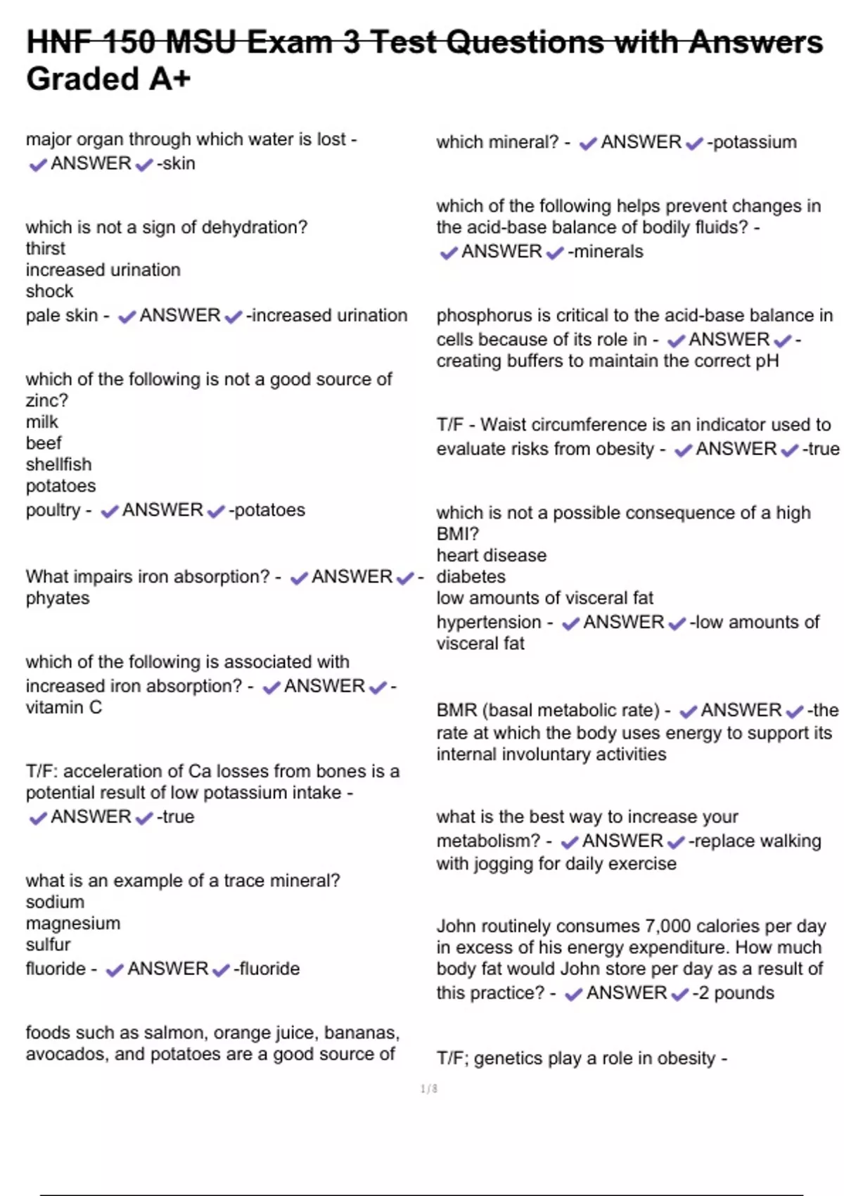 HNF 150 MSU Exam 3 Test Questions with Answers Graded A+