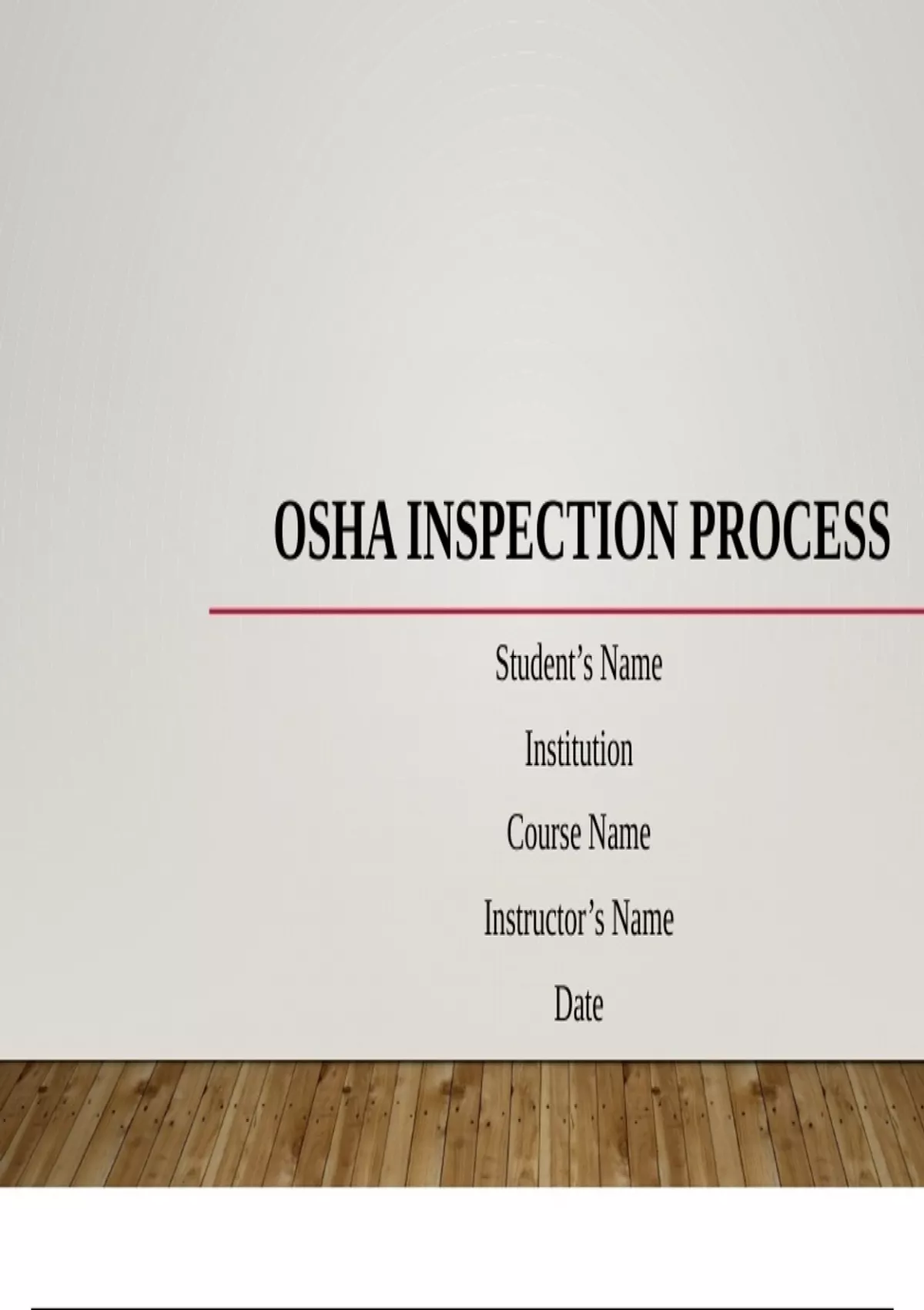 This PowerPoint presentation explains the Occupational Safety and Health Administration (OSHA) inspection process and its role in workplace safety. It covers the OSH Act of 1970, the step-by-step inspection procedure, and common violations such as fall protection, scaffolding safety, and hazard communication. The presentation also discusses employer legal liabilities, criminal sanctions, and strategies to prevent violations through training, safety equipment, record-keeping, and emergency plans. Case examples and references highlight the real-world implications of OSHA compliance.