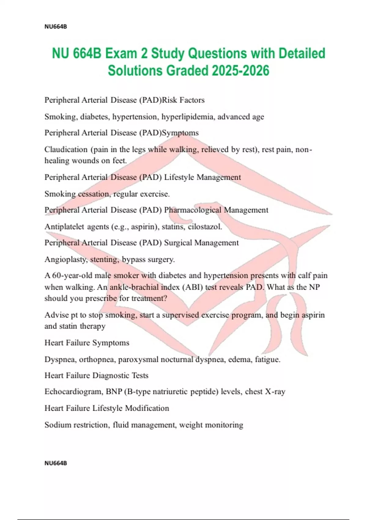 Peripheral Arterial Disease (PAD)Risk Factors Smoking, diabetes, hypertension, hyperlipidemia, advanced age Peripheral Arterial Disease (PAD)Symptoms Claudication (pain in the legs while walking, relieved by rest), rest pain, non-healing wounds on feet. Peripheral Arterial Disease (PAD) Lifestyle Management Smoking cessation, regular exercise. Peripheral Arterial Disease (PAD) Pharmacological Management Antiplatelet agents (e.g., aspirin), statins, cilostazol. Peripheral Arterial Disease (PAD) Surgical Management Angioplasty, stenting, bypass surgery. A 60-year-old male smoker with diabetes and hypertension presents with calf pain when walking. An ankle-brachial index (ABI) test reveals PAD. What as the NP should you prescribe for treatment? Advise pt to stop smoking, start a supervised exercise program, and begin aspirin and statin therapy Heart Failure Symptoms Dyspnea, orthopnea, paroxysmal nocturnal dyspnea, edema, fatigue. Heart Failure Diagnostic Tests Echocardiogram, BNP (B-type natriuretic peptide) levels, chest X-ray Heart Failure Lifestyle Modification Sodium restriction, fluid management, weight monitoring Heart Failure Pharmacological ACE (Angiotensin Converting Enzyme) inhibitors, betablockers, diuretics, aldosterone antagonists. Heart Failure Advanced Therapies ICD (implantable cardioverter-defibrillator), CRT (cardiac resynchronization therapy), heart transplant. A 70-year-old woman with a history of myocardial infarction presents with shortness of breath and ankle swelling. Echocardiogram shows reduced ejection fraction (HFrEF). What is the pharmacological intervention of the clinician? Start on an ACE inhibitor, beta-blocker, and diuretics. Aldosterone Antagonists Eplerenone (Inspra) Spirinolactone (Aldactone) potassium sparing diuretics Hypertension Stages: Normal <120/80 mmHg Hypertension Stage 1 130-139/80-89 mmHg Hypertension Elevated 120-129/<80 mmHg Hypertension Stage 2 : ≥140/90 mmHg Hypertension Lifestyle Treatment Dietary changes (DASH diet), exercise, weight loss, reducing sodium and alcohol intake. Hypertension Pharmacological Thiazide diuretics, ACE inhibitors, ARBs, calcium channel blockers
